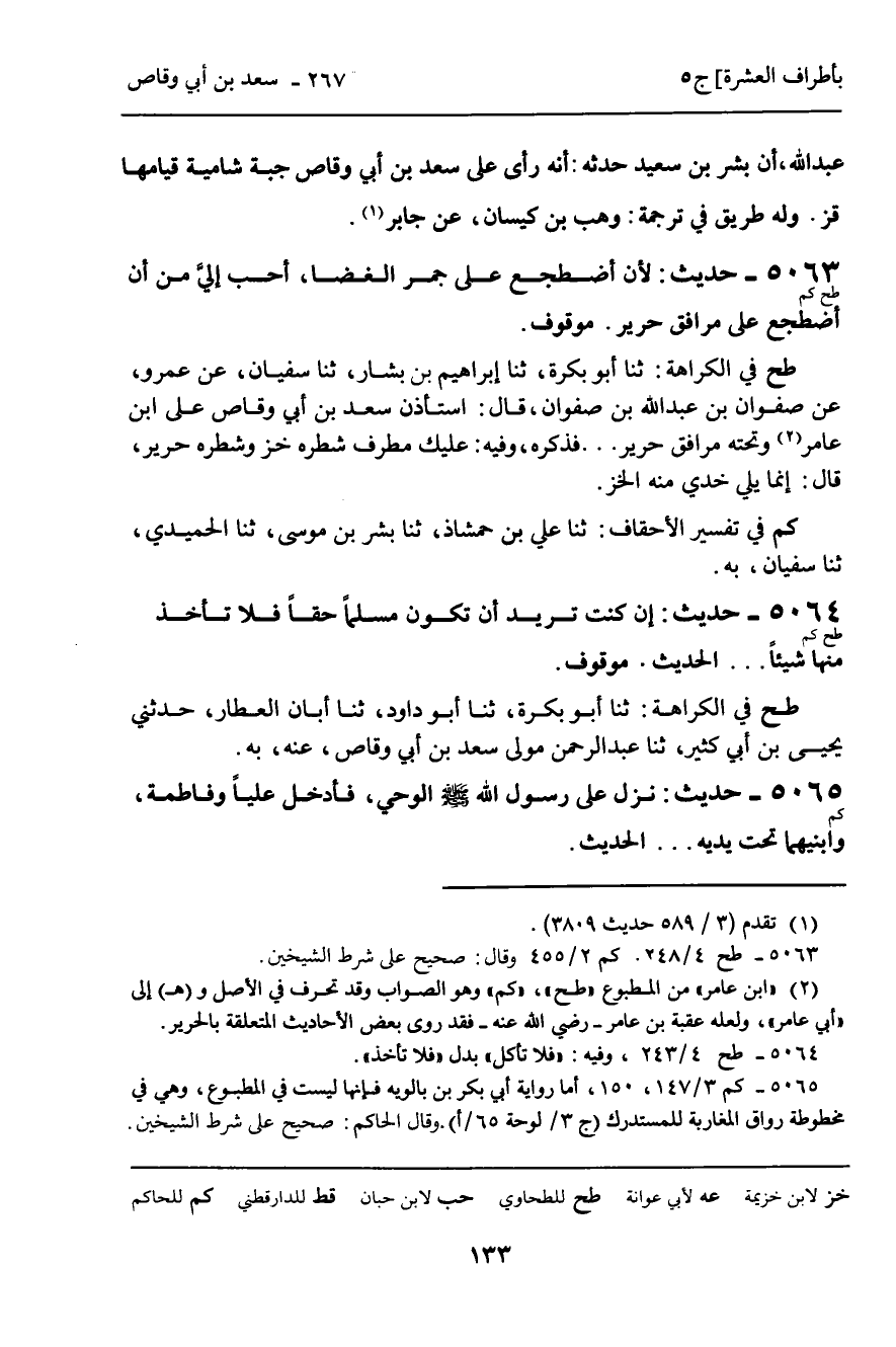 طح فِي الْكَرَاهَةِ: ثنا أَبُو بَكْرَةَ , ثنا إِبْرَاهِيمُ بْنُ بَشَّارٍ , ثنا سُفْيَانُ , عَنْ عَمْرٍو , عَنْ صَفْوَانَ بْنِ عَبْدِ اللَّهِ بْنِ صَفْوَانَ , قَالَ: اسْتَأْذَنَ سَعْدُ بْنُ أَبِي وَقَّاصٍ عَلَى ابْنِ عَامِرٍ وَتَحْتَهُ مَرَافِقُ حَرِيرٍ ... فَذَكَرَهُ , وَفِيهِ: عَلَيْكَ مِطْرَفٌ، شَطْرُهُ خَزٌّ وَشَطْرُهُ حَرِيرٌ , قَالَ: إِنَّمَا يَلِي خَدِّي مِنْهُ الْخَزُّ.