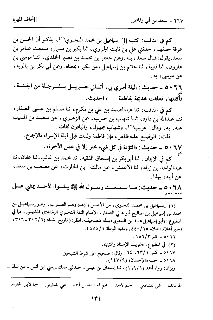 عه فِي الْمَنَاقِبِ: ثنا مُحَمَّدُ بْنُ إِسْمَاعِيلَ الصَّائِغُ , وَالصَّغَانِيُّ , وَغَيْرُهُمَا , قَالُوا: ثنا إِسْحَاقُ بْنُ عِيسَى. وَثنا النُّفَيْلِيُّ , وَيَزِيدُ بْنُ عَبْدِ الصَّمَدِ , وَمُحَمَّدُ بْنُ عَوْفٍ , قَالُوا: ثنا أَبُو مُسْهِرٍ , كِلاهُمَا عَنْ مَالِكٍ , عَنْ أَبِي النَّضْرِ , عَنْ عَامِرِ بْنِ سَعْدٍ , عَنْ أَبِيهِ , بِهِ.