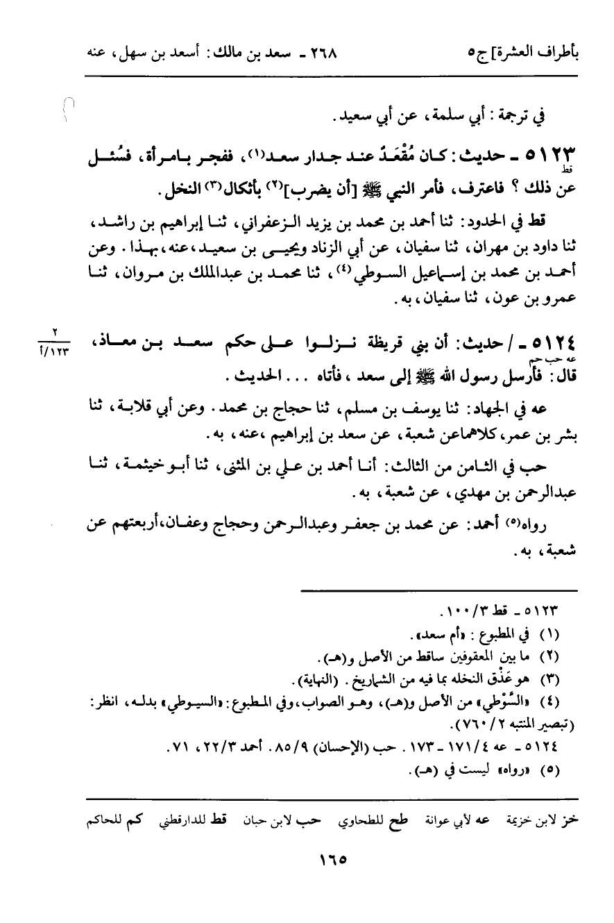5124 - حَدِيثٌ (عه حب حم) : أَنَّ بَنِي قُرَيْظَةَ نَزَلُوا عَلَى حُكْمِ سَعْدِ بْنِ مُعَاذٍ , قَالَ: فَأَرْسَلَ رَسُولُ اللَّهِ، صَلَّى اللَّهُ عَلَيْهِ وَسَلَّمَ، إِلَى سَعْدٍ , فَأَتَاهُ ... الْحَدِيثَ.