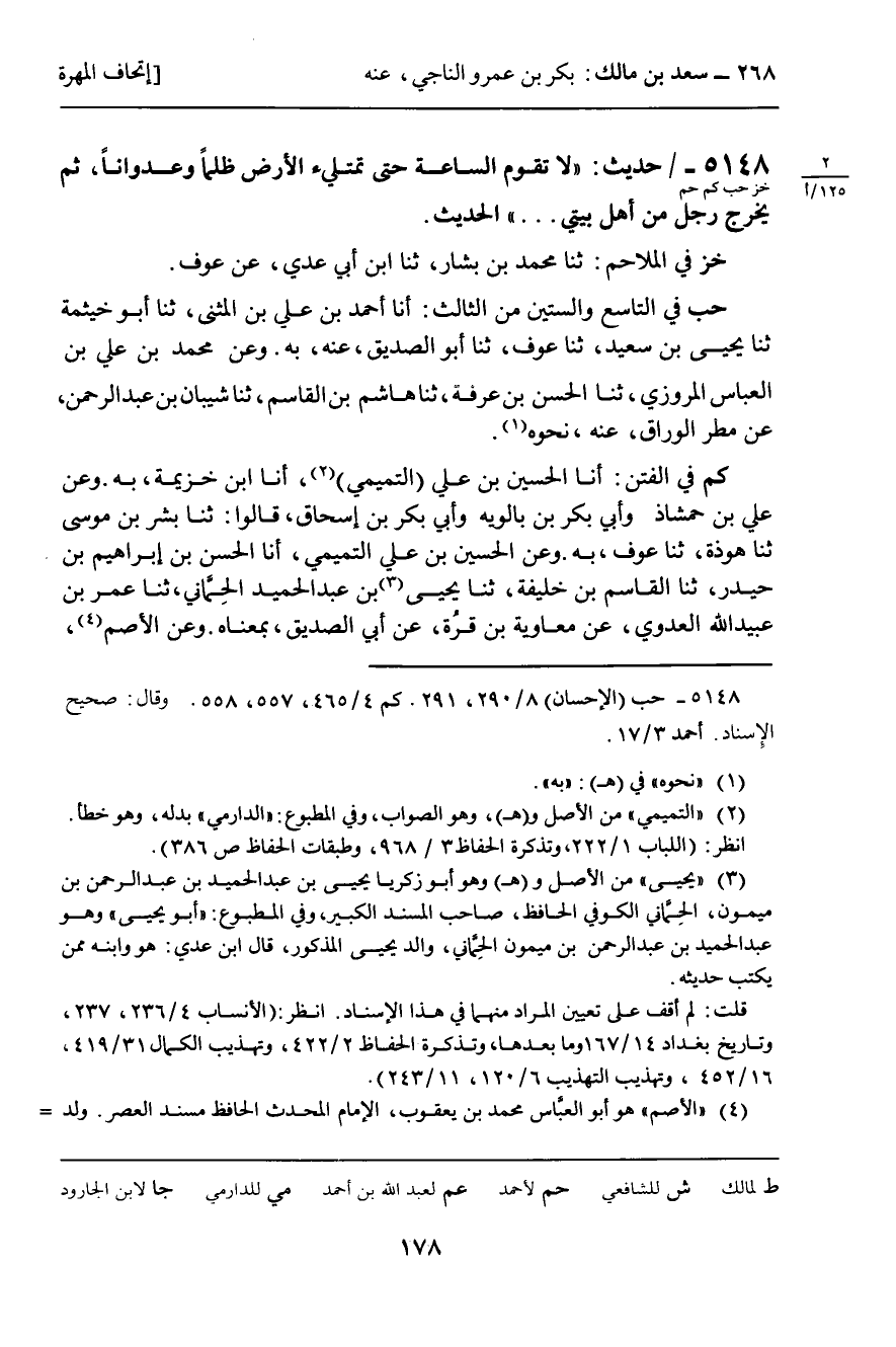 5148 - حَدِيثٌ (خز حب كم حم) : " لا تَقُومُ السَّاعَةُ حَتَّى تَمْتَلِئَ الأَرْضُ ظُلْمًا وَعُدْوَانًا , ثُمَّ يَخْرُجُ رَجُلٌ مِنْ أَهْلِ بَيْتِي ... " الْحَدِيثَ.