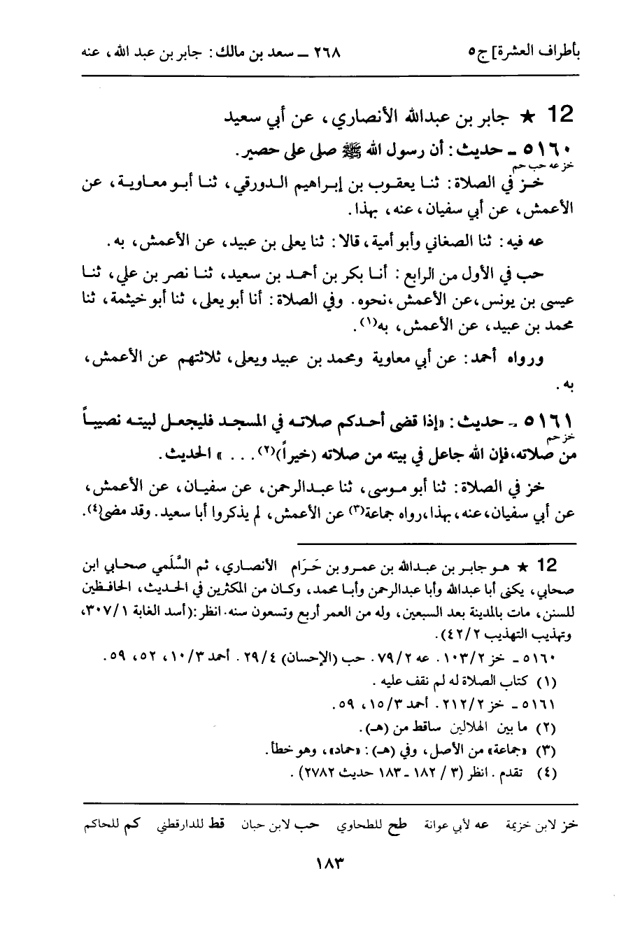 5161 - حَدِيثٌ (خز حم) : " إِذَا قَضَى أَحَدُكُمْ صَلاتَهُ فِي الْمَسْجِدِ فَلْيَجْعَلْ لِبَيْتِهِ نَصِيبًا مِنْ صَلاتِهِ , فَإِنَّ اللَّهَ جَاعِلٌ فِي بَيْتِهِ مِنْ صَلاتِهِ خَيْرًا ... " الْحَدِيثَ.
