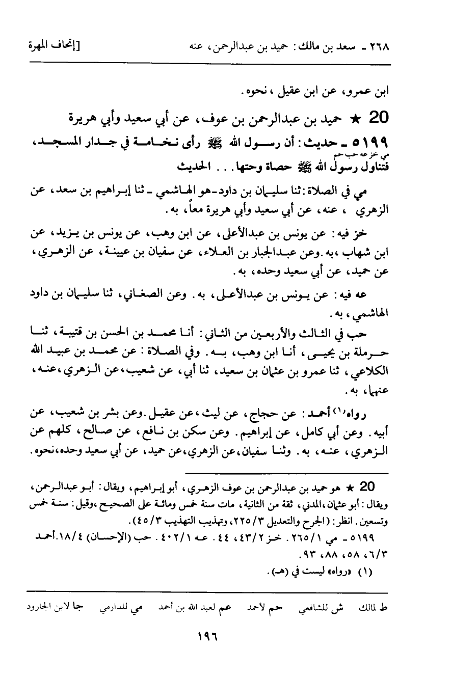 خز فِيهِ: عَنْ يُونُسَ بْنِ عَبْدِ الأَعْلَى , عَنِ ابْنِ وَهْبٍ , عَنْ يُونُسَ بْنِ يَزِيدَ , عَنِ ابْنِ شِهَابٍ , بِهِ. وَعَنْ عَبْدِ الْجَبَّارِ بْنِ الْعَلاءِ , عَنْ سُفْيَانَ بْنِ عُيَيْنَةَ , عَنِ الزُّهْرِيِّ , عَنْ حُمَيْدٍ , عَنْ أَبِي سَعِيدٍ وَحْدَهُ , بِهِ.