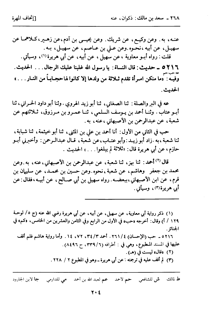 5216 - حَدِيثٌ (عه حب حم) : قَالَ النِّسَاءُ: يَا رَسُولَ اللَّهِ، غَلَبَنَا عَلَيْكَ الرِّجَالُ ... الْحَدِيثَ. وَفِيهِ " مَا مِنْكُنَّ امْرَأَةً تُقَدِّمُ ثَلاثَةً مِنْ وَلَدِهَا إِلا كَانُوا لَهَا حِجَابًا مِنَ النَّارِ ... " الْحَدِيثَ.