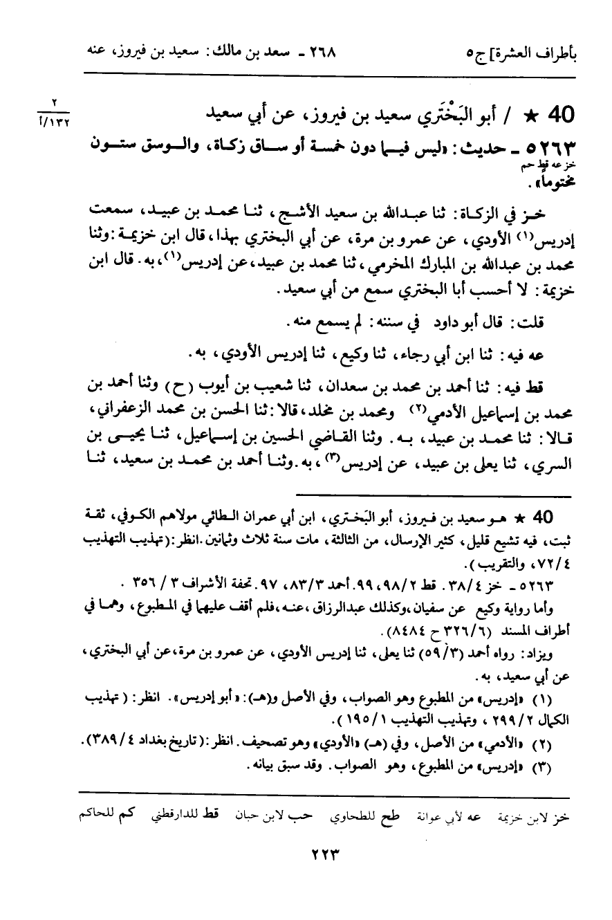 خز فِي الزَّكَاةِ: ثنا عَبْدُ اللَّهِ بْنُ سَعِيدٍ الأَشَجُّ , ثنا مُحَمَّدُ بْنُ عُبَيْدٍ , سَمِعْتُ إِدْرِيسَ الأَوْدِيَّ , عَنْ عَمْرِو بْنِ مُرَّةَ , عَنْ أَبِي الْبَخْتَرِيِّ، بِهَذَا , قَالَ ابْنُ خُزَيْمَةَ: وَثنا مُحَمَّدُ بْنُ عَبْدِ اللَّهِ بْنِ الْمُبَارَكِ الْمُخَرِّمِيُّ , ثنا مُحَمَّدُ بْنُ عُبَيْدٍ , عَنْ إِدْرِيسَ , بِهِ. قَالَ ابْنُ خُزَيْمَةَ: لا أَحْسَبُ أَبَا الْبَخْتَرِيِّ سَمِعَ مِنْ أَبِي سَعِيدٍ.