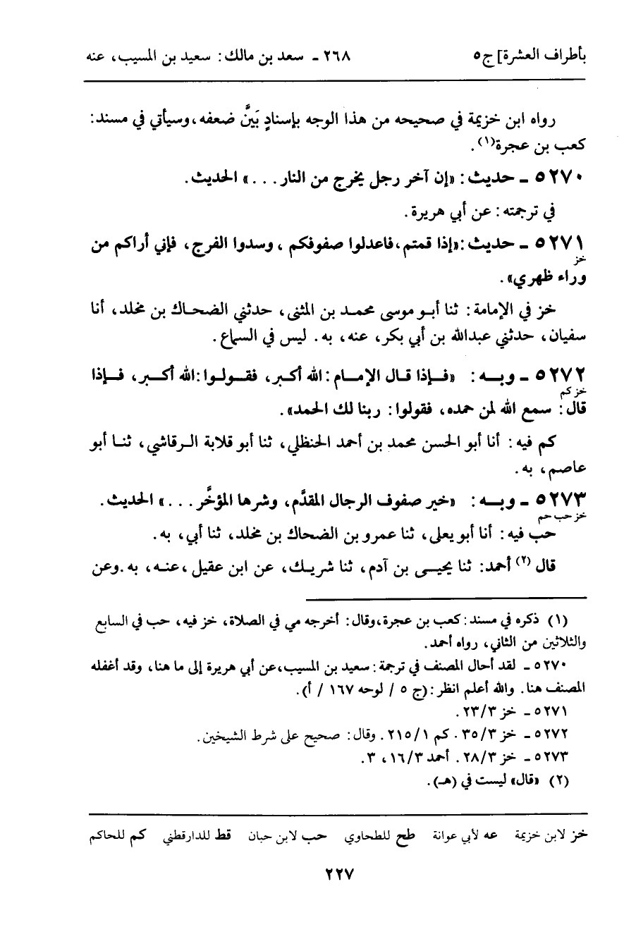 5273 - حَدِيثٌ (خز حب حم) : " خَيْرُ صُفُوفِ الرِّجَالِ الْمُقَدَّمُ , وَشَرُّهَا الْمُؤَخَّرُ ... " الْحَدِيثَ.