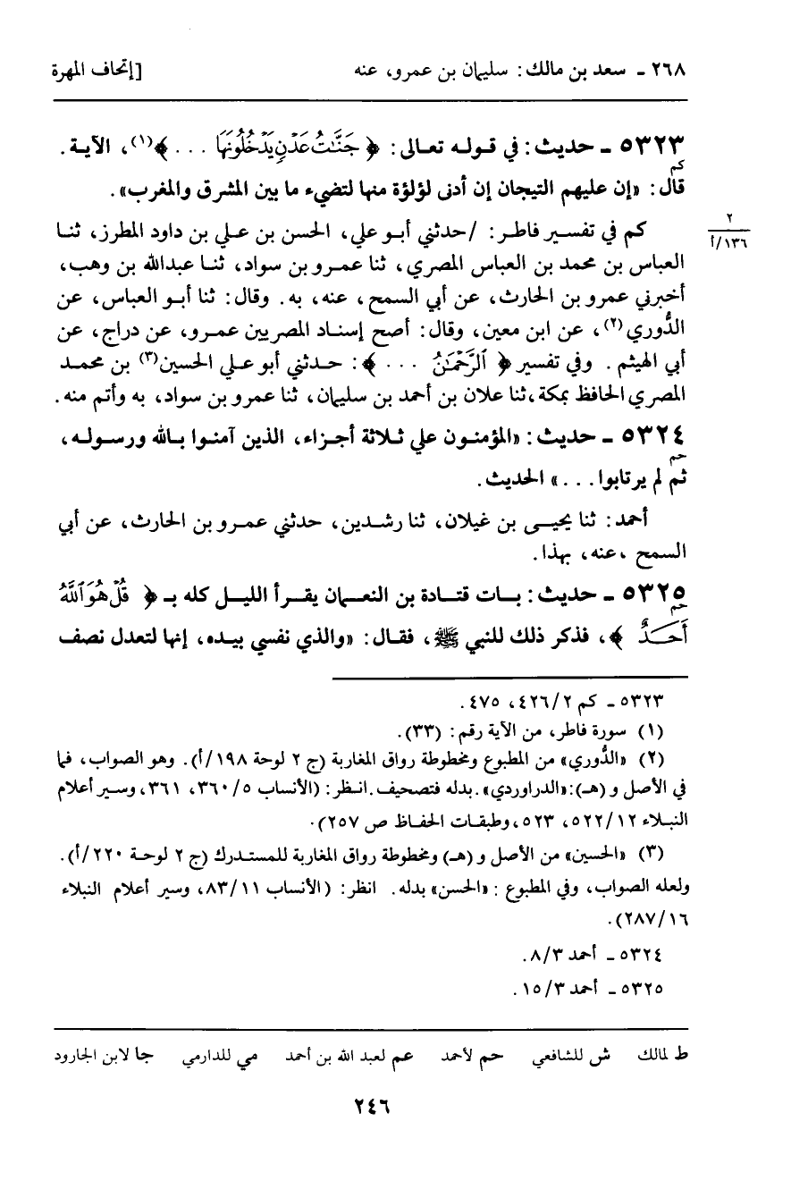 كم فِي تَفْسِيرِ فَاطِرٍ: حَدَّثَنِي أَبُو عَلِيٍّ الْحَسَنُ بْنُ عَلِيِّ بْنِ دَاوُدَ الْمُطَرِّزُ , ثنا الْعَبَّاسُ بْنُ مُحَمَّدِ بْنِ الْعَبَّاسِ الْمِصْرِيُّ , ثنا عَمْرُو بْنُ سَوَّادٍ , ثنا عَبْدُ اللَّهِ بْنُ وَهْبٍ , أَخْبَرَنِي عَمْرُو بْنُ الْحَارِثِ , عَنْ أَبِي السَّمْحِ , عَنْهُ , بِهِ. وَقَالَ: ثنا أَبُو الْعَبَّاسِ , عَنِ الدُّورِيِّ , عَنِ ابْنِ مَعِينٍ , وَقَالَ: أَصَحُّ إِسْنَادِ الْمِصْرِيِّينَ عَمْرٌو , عَنْ دَرَّاجٍ , عَنْ أَبِي الْهَيْثَمِ. وَفِي تَفْسِيرِ الرَّحْمَنِ: حَدَّثَنِي أَبُو عَلِيٍّ الْحُسَيْنُ بْنُ مُحَمَّدٍ الْمِصْرِيُّ الْحَافِظُ، بِمَكَّةَ , ثنا عَلانُ بْنُ أَحْمَدَ بْنِ سُلَيْمَانَ , ثنا عَمْرُو بْنُ سَوَّادٍ , بِهِ وَأَتَمَّ مِنْهُ.
