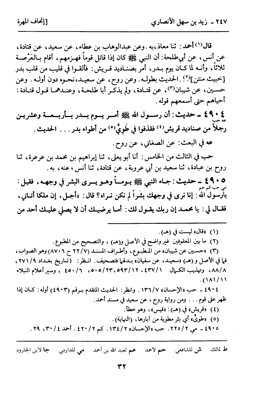 4904 - حَدِيثٌ (عه حب) : أَنَّ رَسُولَ اللَّهِ، صَلَّى اللَّهُ عَلَيْهِ وَسَلَّمَ، أَمَرَ يَوْمَ بَدْرٍ بِأَرْبَعَةٍ وَعِشْرِينَ رَجُلا مِنْ صَنَادِيدِ قُرَيْشٍ فَقُذِفُوا فِي طَوِيٍّ مِنْ أَطْوَاءِ بَدْرٍ ... الْحَدِيثَ.