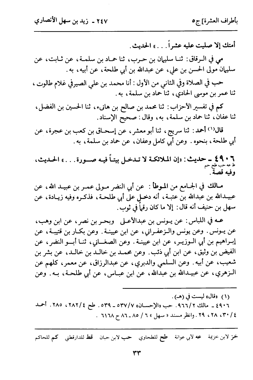 4906 - حَدِيثٌ (ط عه حب طح حم) : " إِنَّ الْمَلائِكَةَ لا تَدْخُلُ بَيْتًا فِيهِ صُورَةٌ ... " الْحَدِيثَ , وَفِيهِ قِصَّةٌ. مَالِكٌ فِي (الْجَامِعِ) مِنَ (الْمُوَطَّإِ) : عَنْ أَبِي النَّضْرِ، مَوْلَى عُمَرَ بْنِ عُبَيْدِ اللَّهِ , عَنْ عُبَيْدِ اللَّهِ بْنِ عَبْدِ اللَّهِ بْنِ عُتْبَةَ , أَنَّهُ دَخَلَ عَلَى أَبِي طَلْحَةَ , فَذَكَرَ وَفِيهِ زِيَادَةٌ , عَنْ سَهْلِ بْنِ حُنَيْفٍ أَنَّهُ قَالَ: إِلا مَا كَانَ رَقْمًا فِي ثَوْبٍ.