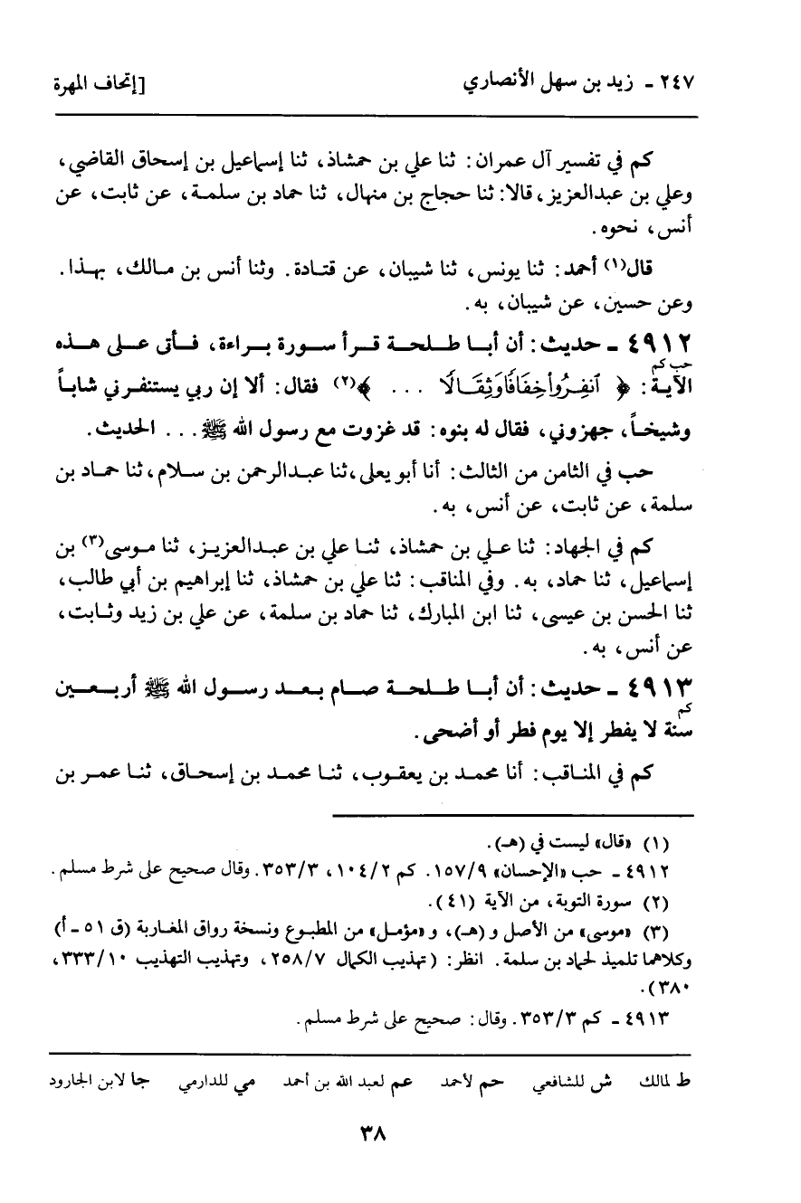 كم فِي الْجِهَادِ: ثنا عَلِيُّ بْنُ حَمْشَاذَ , ثنا عَلِيُّ بْنُ عَبْدِ الْعَزِيزِ , ثنا مُوسَى بْنُ إِسْمَاعِيلَ , ثنا حَمَّادٌ , بِهِ. وَفِي الْمَنَاقِبِ: ثنا عَلِيُّ بْنُ حَمْشَاذَ , ثنا إِبْرَاهِيمُ بْنُ أَبِي طَالِبٍ , ثنا الْحَسَنُ بْنُ عِيسَى , ثنا ابْنُ الْمُبَارَكِ , ثنا حَمَّادُ بْنُ سَلَمَةَ , عَنْ عَلِيِّ بْنِ زَيْدٍ , وَثَابِتٍ , عَنْ أَنَسٍ , بِهِ.