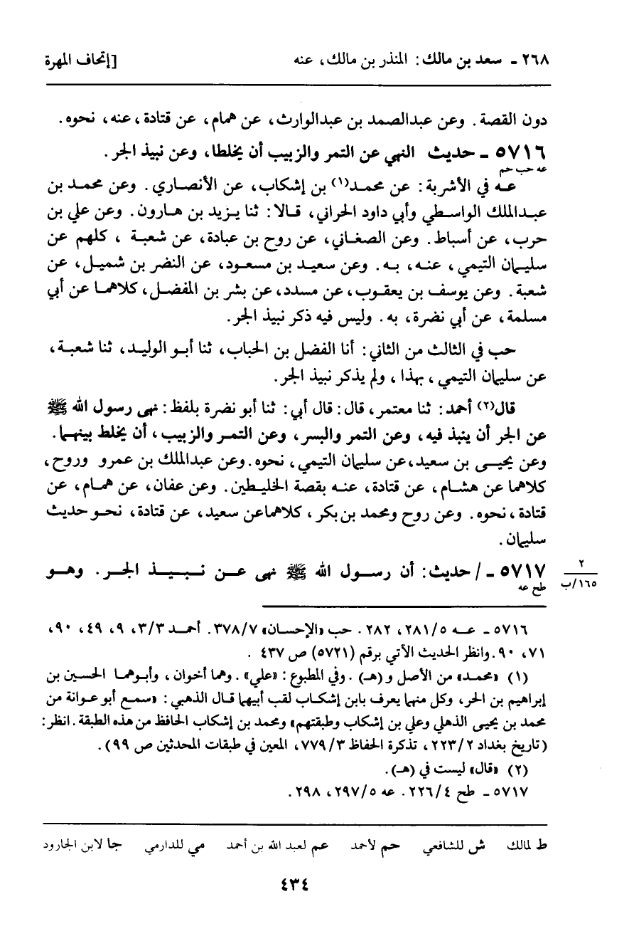 عه فِي الأَشْرِبَةِ: عَنْ مُحَمَّدِ بْنِ إِشْكَابٍ , عَنِ الأَنْصَارِيِّ. وَعَنْ مُحَمَّدِ بْنِ عَبْدِ الْمَلِكِ الْوَاسِطِيِّ , وَأَبِي دَاوُدَ الْحَرَّانِيِّ , قَالا: ثنا يَزِيدُ بْنُ هَارُونَ. وَعَنْ عَلِيِّ بْنِ حَرْبٍ , عَنْ أَسْبَاطٍ. وَعَنِ الصَّغَانِيِّ , عَنْ رَوْحِ بْنِ عُبَادَةَ , عَنْ شُعْبَةَ , كُلُّهُمْ عَنْ سُلَيْمَانَ التَّيْمِيِّ , عَنْهُ , بِهِ. وَعَنْ سَعِيدِ بْنِ مَسْعُودٍ , عَنِ النَّضْرِ بْنِ شُمَيْلٍ , عَنْ شُعْبَةَ. وَعَنْ يُوسُفَ بْنِ يَعْقُوبَ , عَنْ مُسَدَّدٍ , عَنْ بِشْرِ بْنِ الْمُفَضَّلِ , كِلاهُمَا عَنْ أَبِي مَسْلَمَةَ , عَنْ أَبِي نَضْرَةَ , بِهِ. وَلَيْسَ فِيهِ ذِكْرُ نَبِيذِ الْجَرِّ.