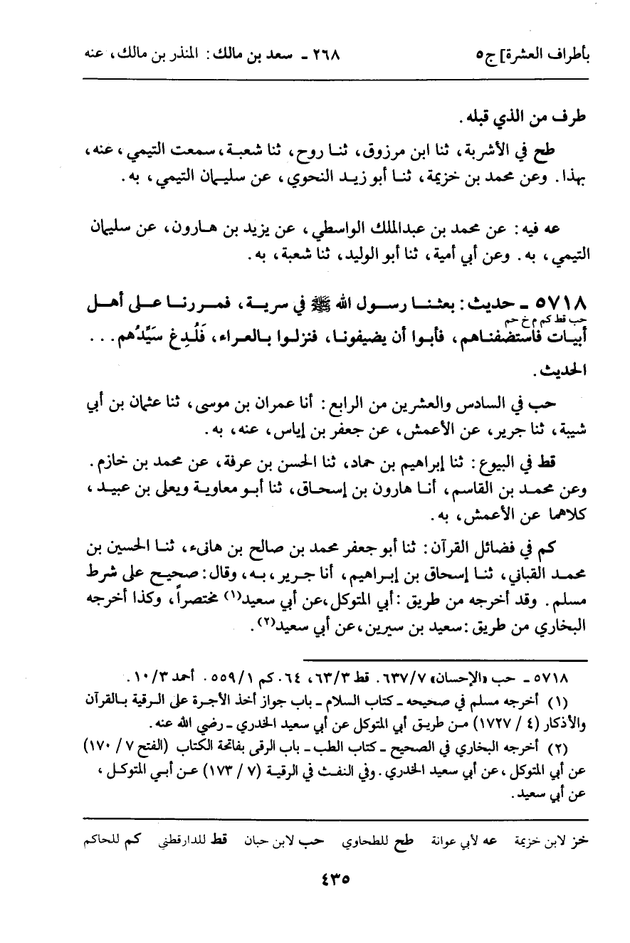 5718 - حَدِيثٌ (حب قط كم م خ حم) : بَعَثَنَا رَسُولُ اللَّهِ، صَلَّى اللَّهُ عَلَيْهِ وَسَلَّمَ، فِي سَرِيَّةٍ , فَمَرَرْنَا عَلَى أَهْلِ أَبْيَاتٍ فَاسْتَضَفْنَاهُمْ , فَأَبَوْا أَنْ يُضَيِّفُونَا , فَنَزَلُوا بِالْعَرَاءِ , فَلُدِغَ سَيِّدُهُمْ ... الْحَدِيثَ.