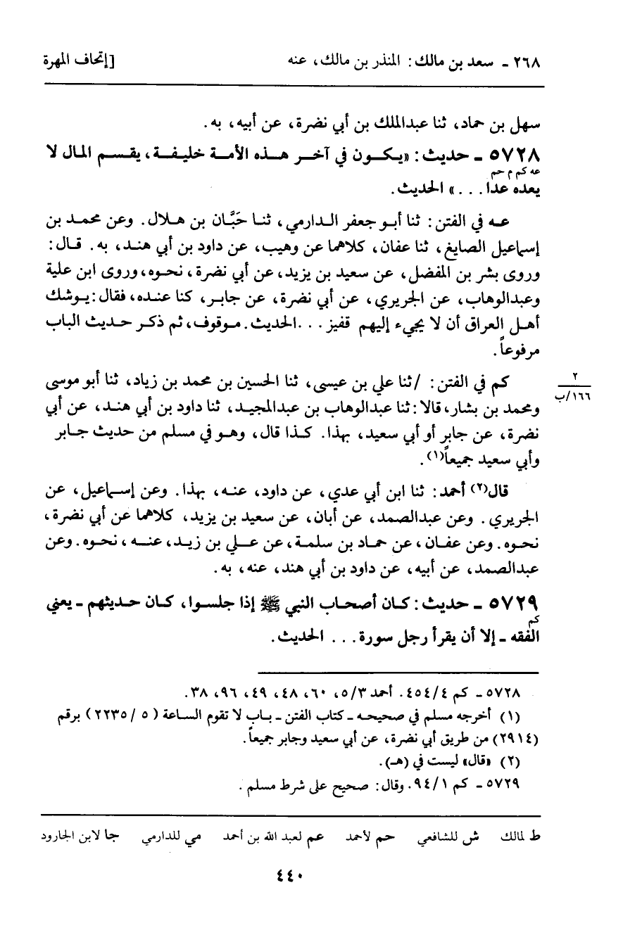 كم فِي الْفِتَنِ: ثنا عَلِيُّ بْنُ عِيسَى , ثنا الْحُسَيْنُ بْنُ مُحَمَّدِ بْنِ زِيَادٍ , ثنا أَبُو مُوسَى , وَمُحَمَّدُ بْنُ بَشَّارٍ , قَالا: ثنا عَبْدُ الْوَهَّابِ بْنُ عَبْدِ الْمَجِيدِ , ثنا دَاوُدُ بْنُ أَبِي هِنْدٍ , عَنْ أَبِي نَضْرَةَ , عَنْ جَابِرٍ , أَوْ أَبِي سَعِيدٍ , بِهَذَا. كَذَا قَالَ , وَهُوَ فِي مُسْلِمٍ مِنْ حَدِيثِ جَابِرٍ , وَأَبِي سَعِيدٍ جَمِيعًا.