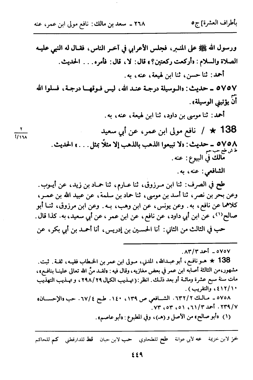 طح فِي الصَّرْفِ: ثنا ابْنُ مَرْزُوقٍ , ثنا عَارِمٌ , ثنا حَمَّادُ بْنُ زَيْدٍ , عَنْ أَيُّوبَ. وَعَنْ بَحْرِ بْنِ نَصْرٍ , ثنا أَسَدُ بْنُ مُوسَى , ثنا حَمَّادُ بْنُ سَلَمَةَ , عَنْ عُبَيْدِ اللَّهِ بْنِ عُمَرَ , كِلاهُمَا عَنْ نَافِعٍ , بِهِ. وَعَنْ يُونُسَ , عَنِ ابْنِ وَهْبٍ , بِهِ. وَعَنِ ابْنِ مَرْزُوقٍ , ثنا أَبُو صَالِحٍ , عَنِ ابْنِ أَبِي دَاوُدَ , عَنْ نَافِعٍ , عَنِ ابْنِ عُمَرَ , عَنْ أَبِي سَعِيدٍ , بِهِ. كَذَا قَالَ.