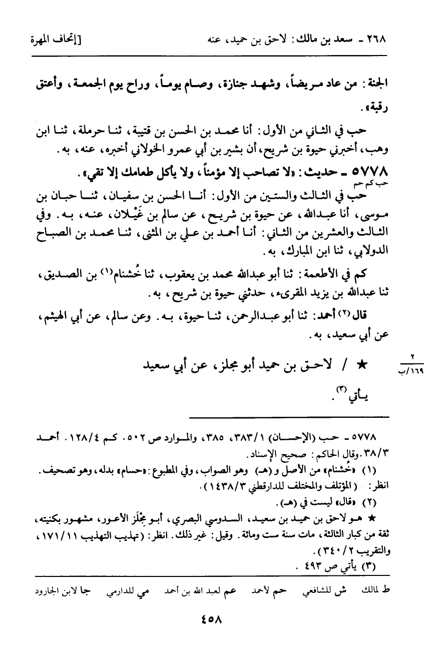5778 - حَدِيثٌ (حب كم حم) : " لا تُصَاحِبْ إِلا مُؤْمِنًا , وَلا يَأْكُلْ طَعَامَكَ إِلا تَقِيٌّ ".