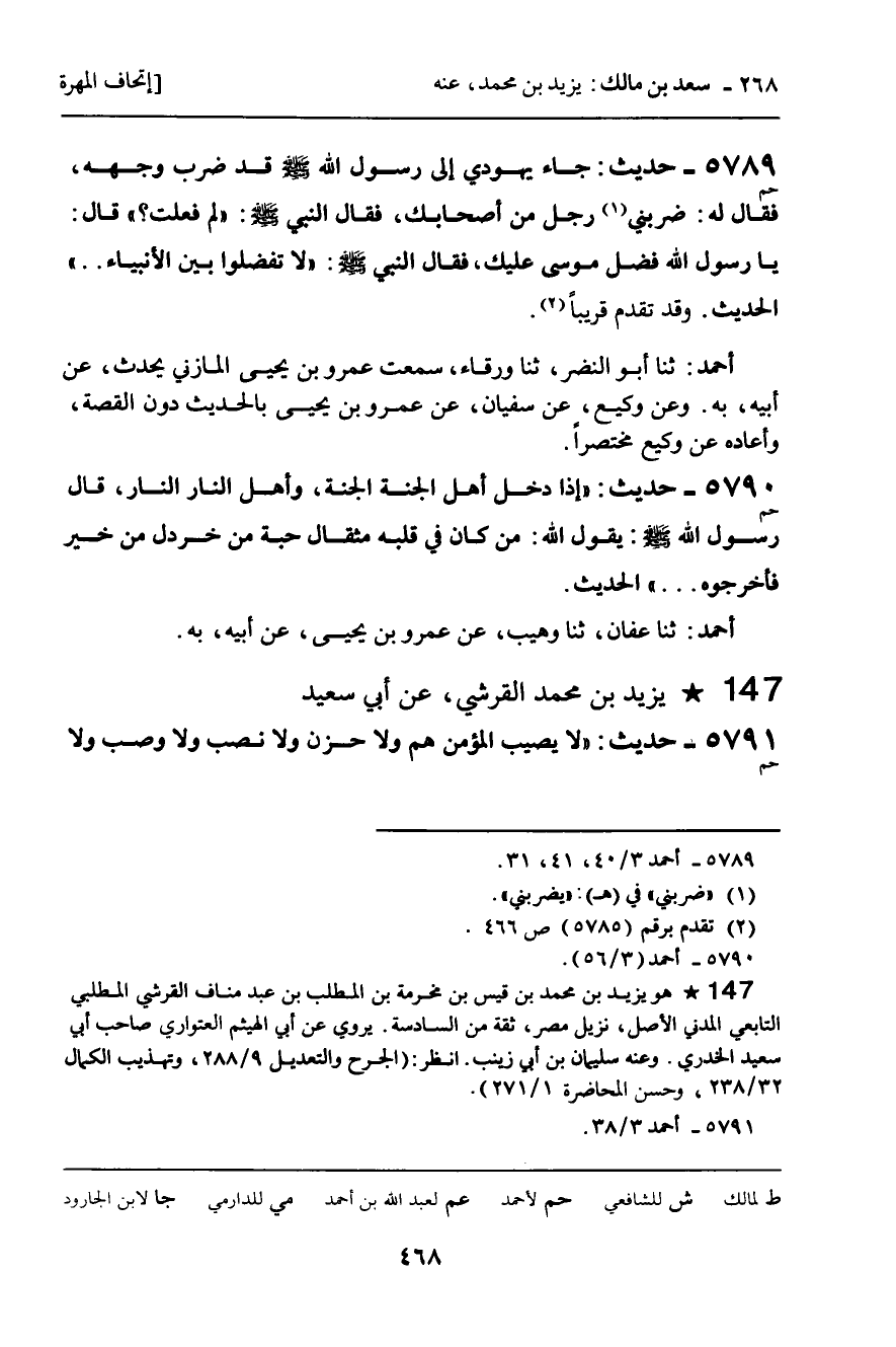 5789 - حَدِيثٌ (حم) : جَاءَ يَهُودِيٌّ إِلَى رَسُولِ اللَّهِ، صَلَّى اللَّهُ عَلَيْهِ وَسَلَّمَ، قَدْ ضُرِبَ وَجْهُهُ , فَقَالَ لَهُ: ضَرَبَنِي رَجُلٌ مِنْ أَصْحَابِكَ , فَقَالَ النَّبِيُّ، صَلَّى اللَّهُ عَلَيْهِ وَسَلَّمَ: " لِمَ فَعَلْتَ؟ " قَالَ: يَا رَسُولَ اللَّهِ، فَضَّلَ مُوسَى عَلَيْكَ , فَقَالَ النَّبِيُّ، صَلَّى اللَّهُ عَلَيْهِ وَسَلَّمَ: " لا تُفَضِّلُوا بَيْنَ الأَنْبِيَاءِ ... " الْحَدِيثَ. وَقَدْ تَقَدَّمَ قَرِيبًا.