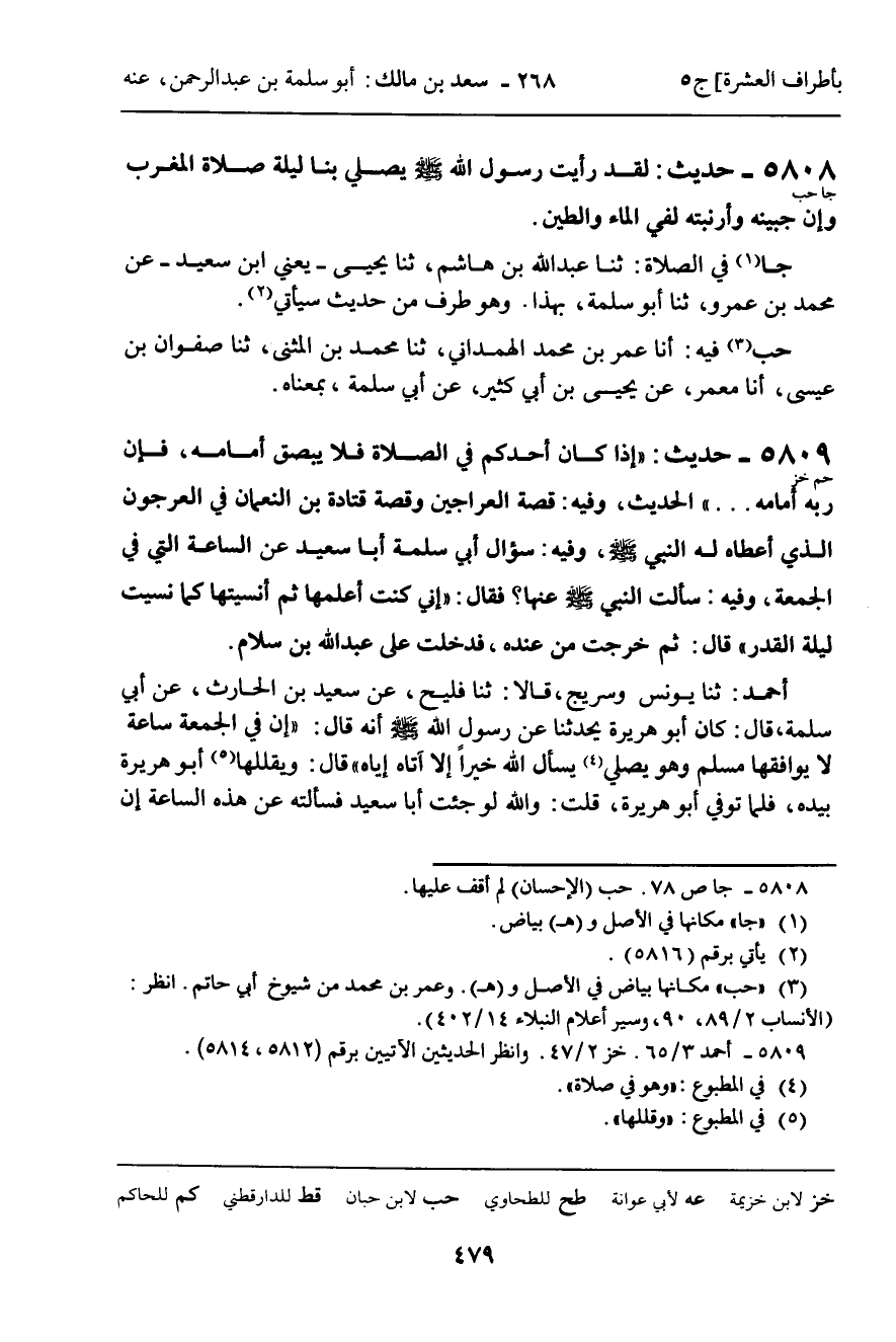5808 - حَدِيثٌ (جا حب) : لَقَدْ رَأَيْتُ رَسُولَ اللَّهِ، صَلَّى اللَّهُ عَلَيْهِ وَسَلَّمَ، يُصَلِّي بِنَا لَيْلَةَ صَلاةِ الْمَغْرِبِ وَإِنَّ جَبِينَهُ وَأَرْنَبَتَهُ لَفِي الْمَاءِ وَالطِّينِ.