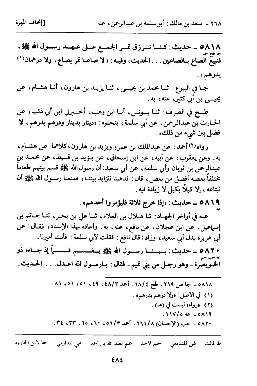 5820 - حَدِيثٌ (عه حب حم) : بَيْنَا رَسُولُ اللَّهِ، صَلَّى اللَّهُ عَلَيْهِ وَسَلَّمَ، يَقْسِمُ قَسْمًا إِذْ جَاءَهُ ذُو الْخُوَيْصِرَةِ، وَهُوَ رَجُلٌ مِنْ بَنِي تَمِيمٍ، فَقَالَ: يَا رَسُولَ اللَّهِ، اعْدِلْ ... الْحَدِيثَ.