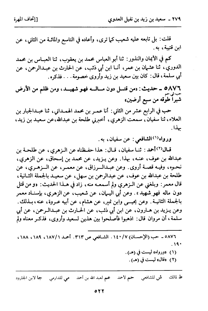 قَالَ أَحْمَدُ: ثنا سُفْيَانُ , قَالَ: هَذَا حَفِظْنَاهُ عَنِ الزُّهْرِيِّ , عَنْ طَلْحَةَ بْنِ عَبْدِ اللَّهِ بْنِ عَوْفٍ , عَنْهُ , بِهَذَا. وَعَنْ يَزِيدَ , عَنْ مُحَمَّدِ بْنِ إِسْحَاقَ , عَنِ الزُّهْرِيِّ , نَحْوَهُ , وَفِيهِ قِصَّةُ أَرْوَى. وَعَنْ عَبْدِ الرَّزَّاقِ , عَنْ مَعْمَرٍ , عَنِ الزُّهْرِيِّ , عَنْ طَلْحَةَ بْنِ عَبْدِ اللَّهِ بْنِ عَوْفٍ , عَنْ عَبْدِ الرَّحْمَنِ بْنِ سَهْلٍ , عَنْ سَعِيدٍ بِالْجُمْلَةِ الثَّانِيَةِ , قَالَ مَعْمَرٌ: وَبَلَغَنِي عَنِ الزُّهْرِيِّ وَلَمْ أَسْمَعْهُ مِنْهُ , زَادَ فِي هَذَا الْحَدِيثِ: " وَمَنْ قُتِلَ دُونَ مَالِهِ فَهُوَ شَهِيدٌ ". وَعَنْ أَبِي الْيَمَانِ , عَنْ شُعَيْبٍ , عَنِ الزُّهْرِيِّ , بِإِسْنَادِ مَعْمَرٍ بِالْجُمْلَةِ الثَّانِيَةِ. وَعَنْ يَحْيَى , وَابْنِ نُمَيْرٍ , عَنْ هِشَامٍ , عَنْ أَبِي , عَنْ عُرْوَةَ , عَنْهُ , بِذَلِكَ.
