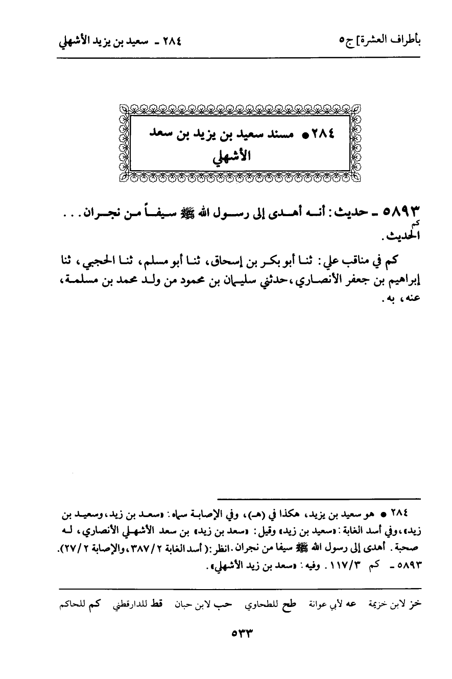 5893 - حَدِيثٌ (كم) : أَنَّهُ أَهْدَى إِلَى رَسُولِ اللَّهِ، صَلَّى اللَّهُ عَلَيْهِ وَسَلَّمَ، سَيْفًا مِنْ نَجْرَانَ ... " الْحَدِيثَ.