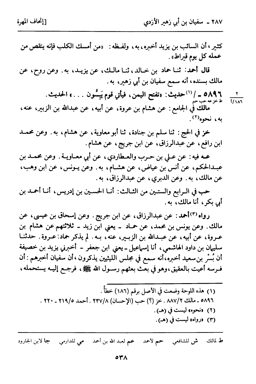 رَوَاهُ أَحْمَدُ: عَنْ عَبْدِ الرَّزَّاقِ , عَنِ ابْنِ جُرَيْجٍ. وَعَنْ إِسْحَاقَ بْنِ عِيسَى , عَنْ مَالِكٍ. وَعَنْ يُونُسَ بْنِ مُحَمَّدٍ، عَنْ حَمَّادٍ؛ يَعْنِي: ابْنَ زَيْدٍ، ثَلاثَتُهُمْ عَنْ هِشَامِ بْنِ عُرْوَةَ، عَنْ أَبِيهِ , عَنْ عُبَيْدِ اللَّهِ بْنِ الزُّبَيْرِ , عَنْهُ , بِهِ. لَمْ يَذْكُرْ حَمَّادٌ: عُرْوَةَ. حَدَّثَنَا سُلَيْمَانُ بْنُ دَاوُدَ الْهَاشِمِيُّ , أنا إِسْمَاعِيلُ؛ يَعْنِي: ابْنَ جَعْفَرٍ، أَخْبَرَنِي يَزِيدُ بْنُ خُصَيْفَةَ، أَنَّ بُسْرَ بْنَ سَعِيدٍ أَخْبَرَهُ , أَنَّهُ سَمِعَ فِي مَجْلِسِ اللَّيْثِيِّينَ يَذْكُرُونَ , أَنَّ سُفْيَانَ أَخْبَرَهُمْ: أَنَّ فَرَسَهُ أَعْيَتْ بِالْعَقِيقِ , وَهُوَ فِي بَعْثٍ بَعَثَهُمْ رَسُولُ اللَّهِ، صَلَّى اللَّهُ عَلَيْهِ وَسَلَّمَ , فَرَجَعَ إِلَيْهِ يَسْتَحْمِلُهُ