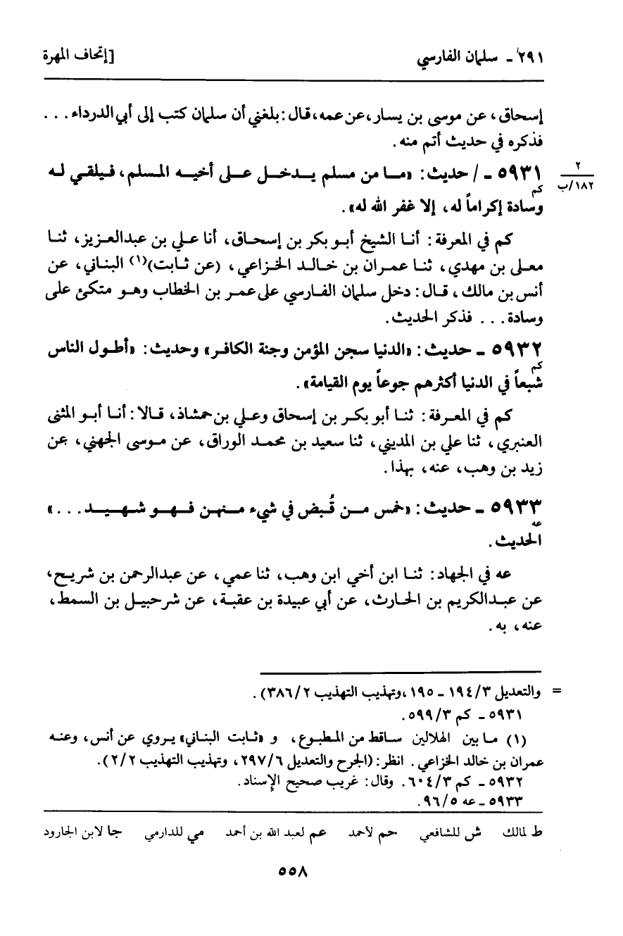 كم فِي الْمَعْرِفَةِ: أنا الشَّيْخُ أَبُو بَكْرِ بْنُ إِسْحَاقَ , أنا عَلِيُّ بْنُ عَبْدِ الْعَزِيزِ , ثنا مُعَلَّى بْنُ مَهْدِيٍّ , ثنا عِمْرَانُ بْنُ خَالِدٍ الْخُزَاعِيُّ , عَنْ ثَابِتٍ الْبُنَانِيِّ , عَنْ أَنَسِ بْنِ مَالِكٍ , قَالَ: دَخَلَ سَلْمَانُ الْفَارِسِيُّ عَلَى عُمَرَ بْنِ الْخَطَّابِ وَهُوَ مُتَّكِئٌ عَلَى وِسَادَةٍ ... فَذَكَرَ الْحَدِيثَ.