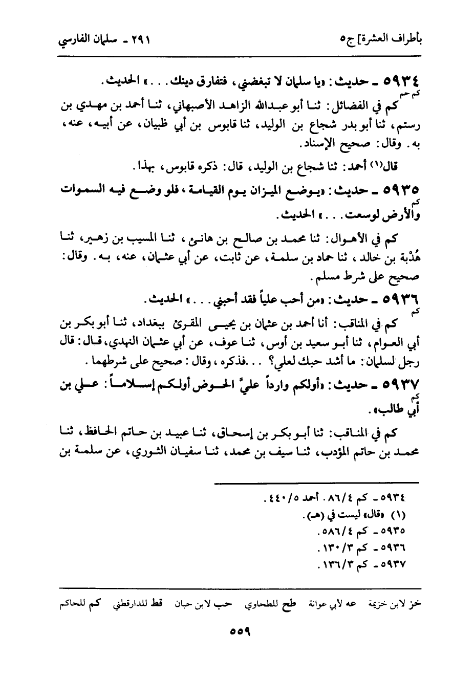 كم فِي الْمَنَاقِبِ: أنا أَحْمَدُ بْنُ عُثْمَانَ بْنِ يَحْيَى الْمُقْرِئُ، بِبَغْدَادَ , ثنا أَبُو بَكْرِ بْنُ أَبِي الْعَوَّامِ , ثنا أَبُو سَعِيدِ بْنُ أَوْسٍ , ثنا عَوْفٌ , عَنْ أَبِي عُثْمَانَ النَّهْدِيِّ , قَالَ: قَالَ رَجُلٌ لِسَلْمَانَ: مَا أَشَدُّ حُبِّكَ لِعَلِيٍّ؟ ... فَذَكَرَهُ , وَقَالَ: صَحِيحٌ عَلَى شَرْطِهِمَا.