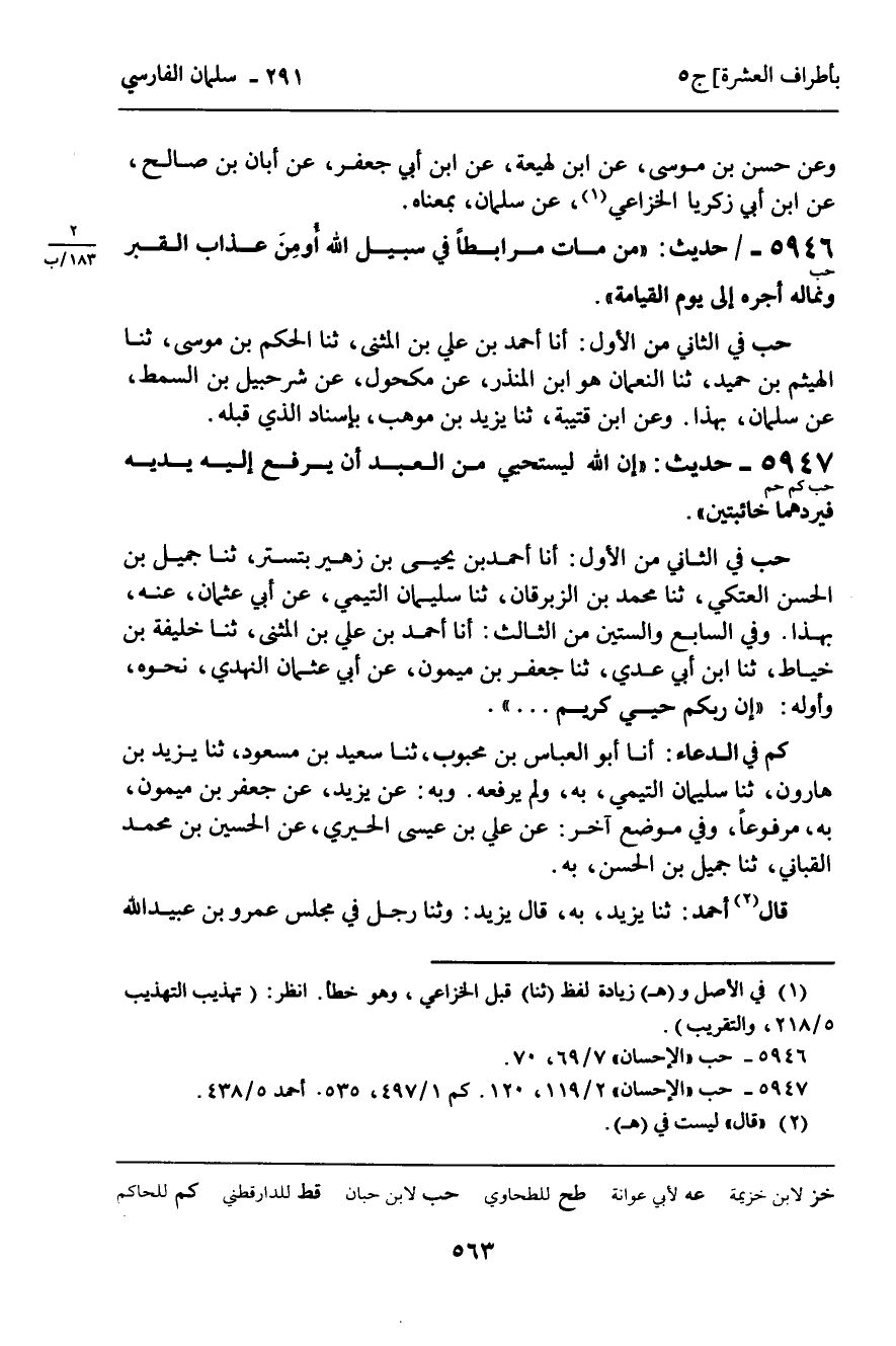 حب فِي الثَّانِي مِنَ الأَوَّلِ: أنا أَحْمَدُ بْنُ يَحْيَى بْنِ زُهَيْرٍ، بِتُسْتَرَ , ثنا جَمِيلُ بْنُ الْحَسَنِ الْعَتَكِيُّ , ثنا مُحَمَّدُ بْنُ الزِّبْرِقَانِ , ثنا سُلَيْمَانُ التَّيْمِيُّ، عَنْ أَبِي عُثْمَانَ , عَنْهُ , بِهَذَا. وَفِي السَّابِعِ وَالسِّتِّينَ مِنَ الثَّالِثِ: أنا أَحْمَدُ بْنُ عَلِيِّ بْنِ الْمُثَنَّى , ثنا خَلِيفَةُ بْنُ خَيَّاطٍ , ثنا ابْنُ أَبِي عَدِيٍّ , ثنا جَعْفَرُ بْنُ مَيْمُونٍ , عَنْ أَبِي عُثْمَانَ النَّهْدِيِّ , نَحْوَهُ , وَأَوَّلُهُ: " إِنَّ رَبَّكُمْ حَيِيٌّ كَرِيمٌ ... ".