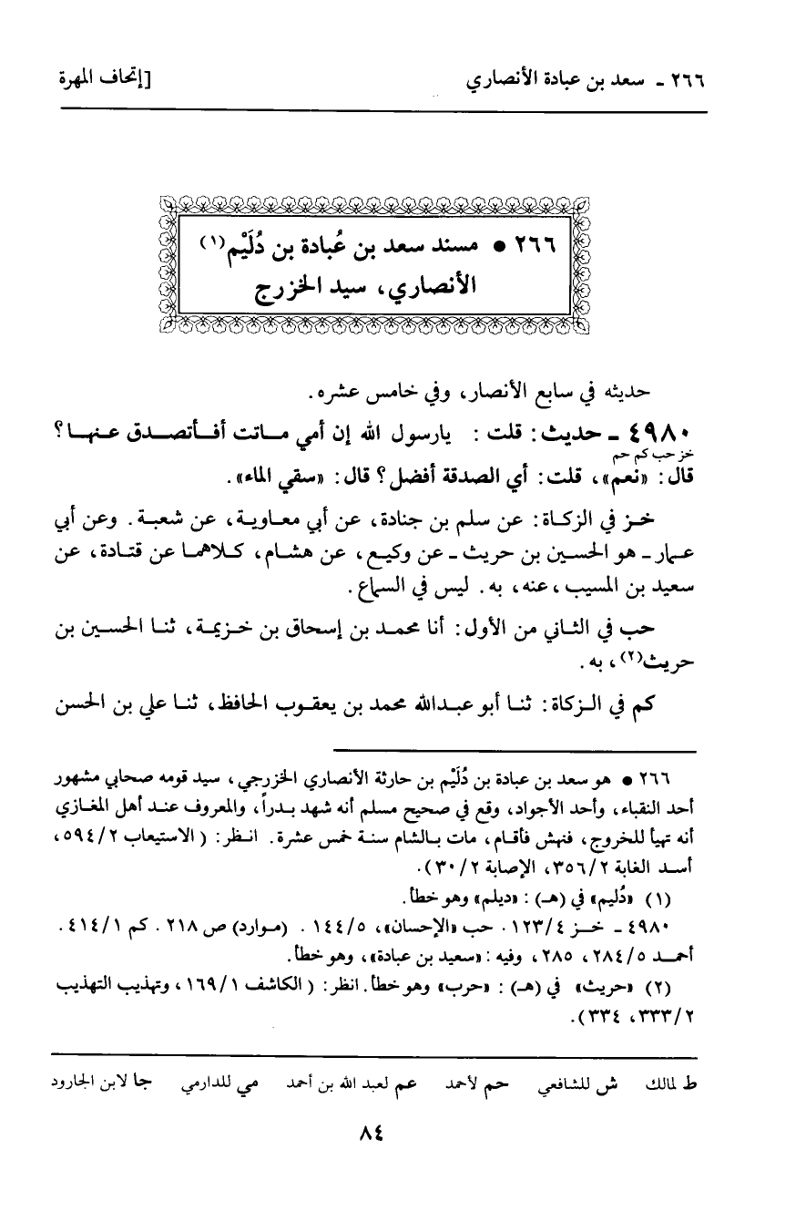 266 ـ مُسْنَدُ سَعْدِ بْنِ عُبَادَةَ بْنِ دُلَيْمٍ الأَنْصَارِيِّ , سَيِّدِ الْخَزْرَجِ
