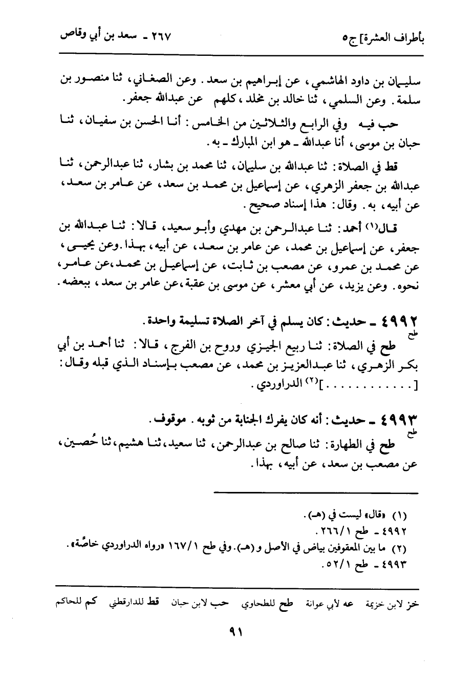 طح فِي الطَّهَارَةِ: ثنا صَالِحُ بْنُ عَبْدِ الرَّحْمَنِ , ثنا سَعِيدٌ , ثنا هُشَيْمٌ , ثنا حُصَيْنٌ , عَنْ مُصْعَبِ بْنِ سَعْدٍ , عَنْ أَبِيهِ , بِهَذَا.