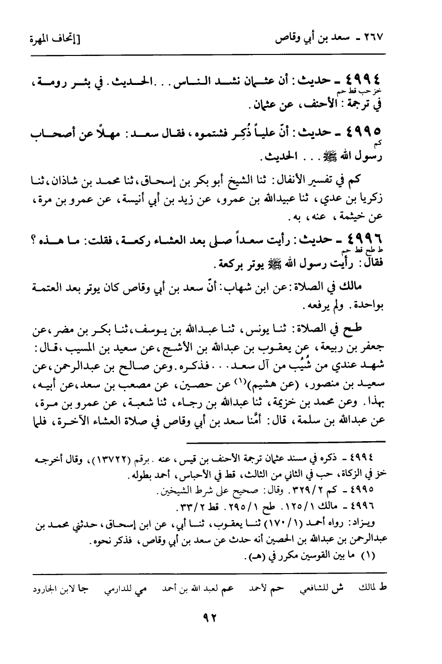 4996 - حَدِيثٌ (ط طح قط حم) : رَأَيْتُ سَعْدًا صَلَّى بَعْدَ الْعِشَاءِ رَكْعَةً , فَقُلْتُ: مَا هَذِهِ؟ فَقَالَ: رَأَيْتُ رَسُولَ اللَّهِ صَلَّى اللَّهُ عَلَيْهِ وَسَلَّمَ، يُوتِرُ بِرَكْعَةٍ.