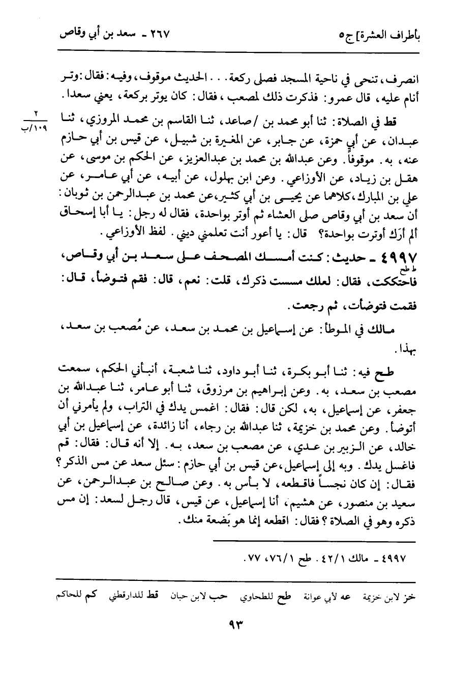 4997 - حَدِيثٌ (ط طح) : كُنْتُ أُمْسِكُ الْمُصْحَفَ عَلَى سَعْدِ بْنِ أَبِي وَقَّاصٍ , فَاحْتَكَكْتُ , فَقَالَ: لَعَلَّكَ مَسَسْتَ ذَكَرَكَ , فَقُلْتُ: نَعَمْ , قَالَ: فَقُمْ فَتَوَضَّأْ , قَالَ: فَقُمْتُ فَتَوَضَّأْتُ , ثُمَّ رَجَعْتُ.