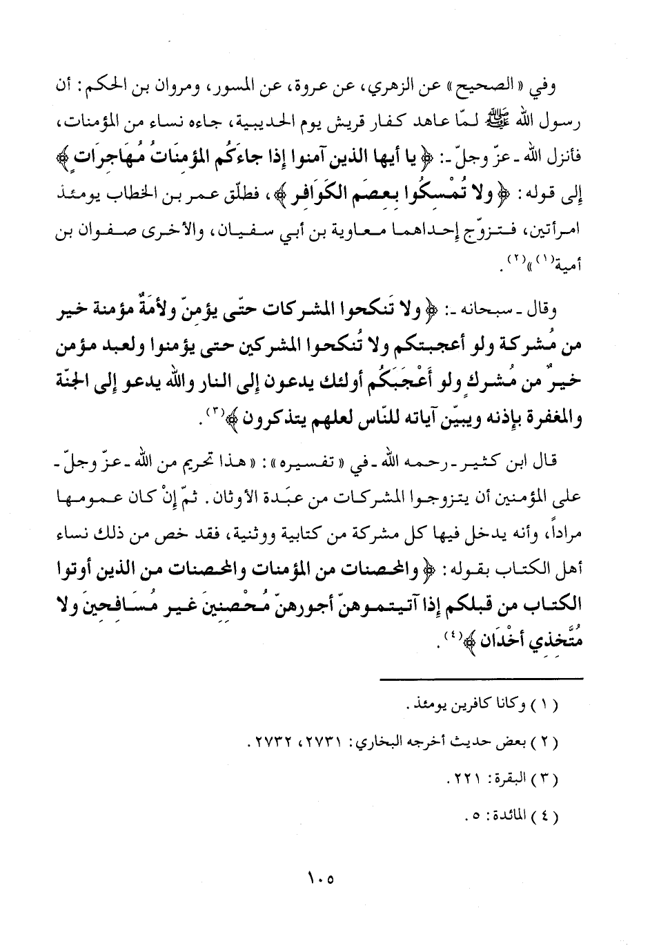 قال ابن كثير -رحمه الله- في "تفسيره": "هذا تحريم من الله -عزّ وجلّ- على المؤمنين أن يتزوجوا المشركات من عبَدة الأوثان. ثمّ إِنْ كان عمومها مراداً، وأنه يدخل فيها كل مشركة من كتابية ووثنية، فقد خص من ذلك نساء أهل الكتاب بقوله: {والمحصنات من المؤمنات والمحصنات من الذين أوتوا الكتاب من قبلكم إِذا آتيتموهنّ أجورهنّ مُحْصنينَ غير مُسَافحينَ ولا مُتَّخِذِي أخْدَان} (¬4).
