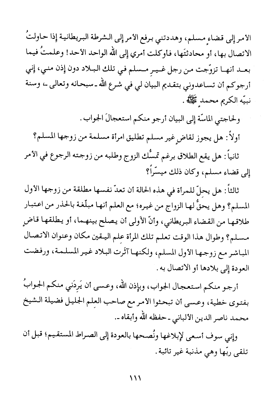 الأمر إِلى قضاءٍ مسلم، وهددتني برفع الأمر إِلى الشرطة البريطانية إِذا حاولتُ الاتصال بها، أو محادثتَها، فأوكلت أمري إِلى الله الواحد الأحد! وعلمتُ فيما بعد أنها تزوّجت من رجل غيرِ مسلم في تلك البلاد دون إِذن مني، إِني أرجوكم أن تساعدوني بتقديم البيان لي في شرع الله -سبحانه وتعالى-، وسنة نبيّه الكريم محمد - صَلَّى اللَّهُ عَلَيْهِ وَسَلَّمَ -.