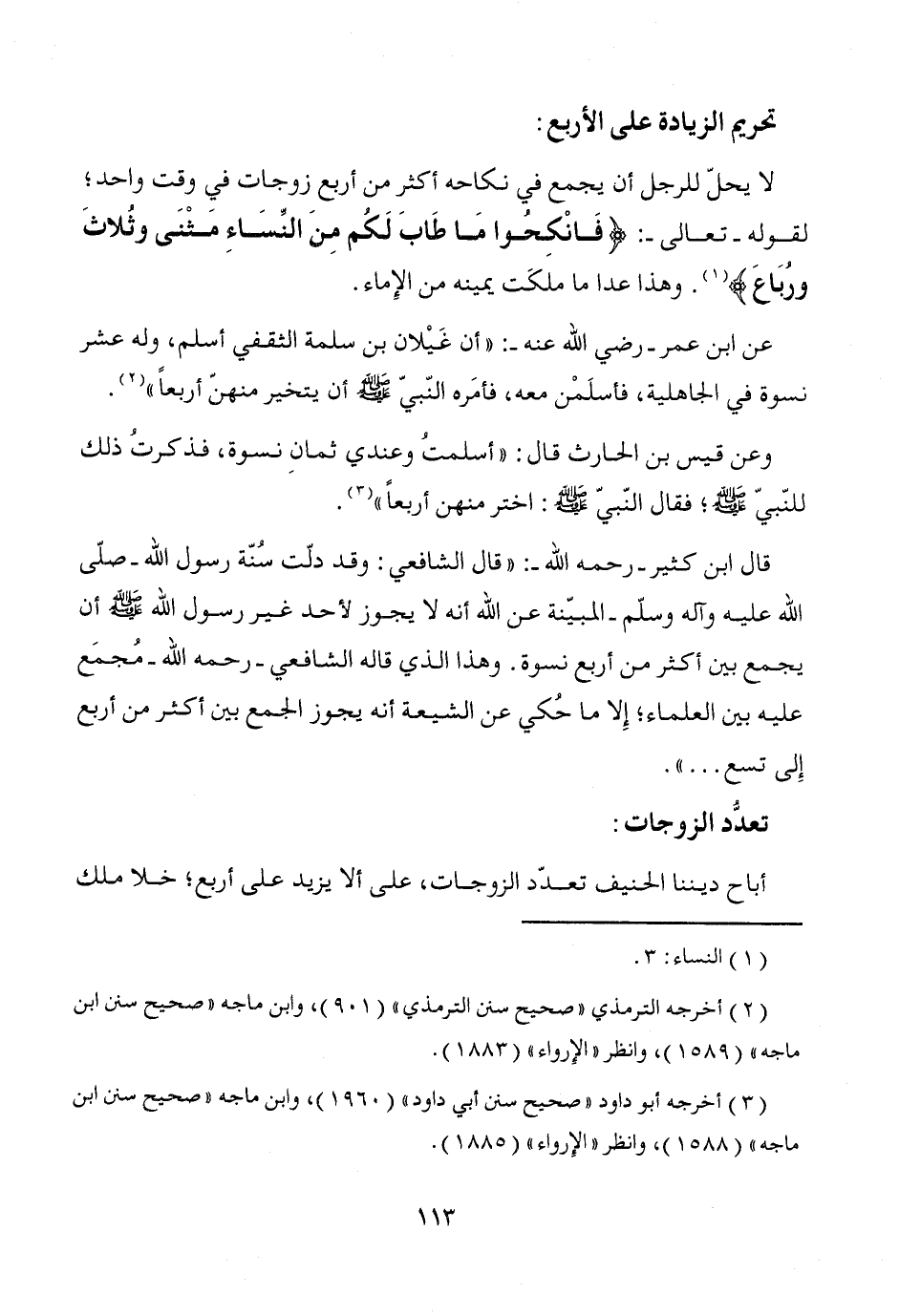 قال ابن كثير -رحمه الله-: "قال الشافعي: وقد دلّت سُنّة رسول الله -صلّى الله عليه وآله وسلّم- المبيّنة عن الله أنه لا يجوز لأحد غير رسول الله - صَلَّى اللَّهُ عَلَيْهِ وَسَلَّمَ - أن يجمع بين أكثر من أربع نسوة. وهذا الذي قاله الشافعي -رحمه الله- مُجمَع عليه بين العلماء؛ إِلا ما حُكي عن الشيعة أنه يجوز الجمع بين أكثر من أربع إِلى تسع ... ".