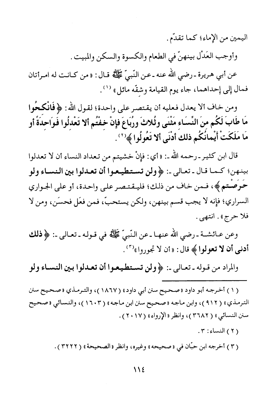 قال ابن كثير -رحمه الله-: "أي: فإِنْ خشيتم من تعداد النساء أن لا تعدلوا بينهن؛ كما قال -تعالى-: {ولن تستطيعوا أن تعدلوا بين النساء ولو حَرَصتم}، فمن خاف من ذلك؛ فليقتصر على واحدة، أو على الجواري السراري؛ فإِنه لا يجب قسم بينهن، ولكن يستحبّ، فمن فعَل فحسَن، ومن لا فلا حرج". انتهى.