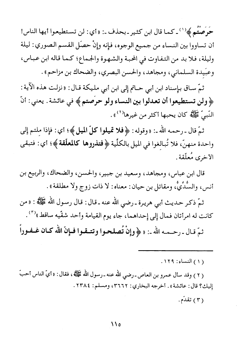 ثمّ قال -رحمه الله-: "وقوله: {فلا تميلوا كلّ الميل}؛ أي: فإِذا مِلتم إلى واحدة منهنّ، فلا تُبالِغوا في الميل بالكلِّية {فتذروها كالمعلّقة}؛ أي: فتبقى الأخرى مُعلّقة.