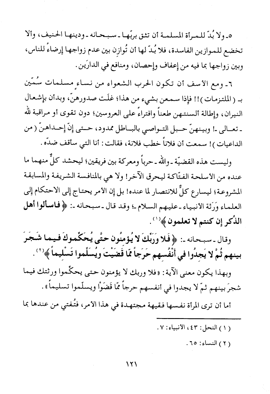 وليست هذه القضيّة -والله- حرباً ومعركة بين فريقين؛ ليحشد كلٌّ منهما ما عنده من الأسلحة الفتّاكة ليحرق الآخر! ولا هي بالمنافسة الشريفة والمسابقة المشروعة؛ ليسارع كلٌّ للانتصار لما عنده! بل إِن الأمر يحتاج إِلى الاحتكام إِلى العلماء وَرَثة الأنبياء -عليهم السلام-؛ وقد قال -سبحانه-: {فاسألوا أهل الذِّكر إِن كنتم لا تعلمون} (¬1).