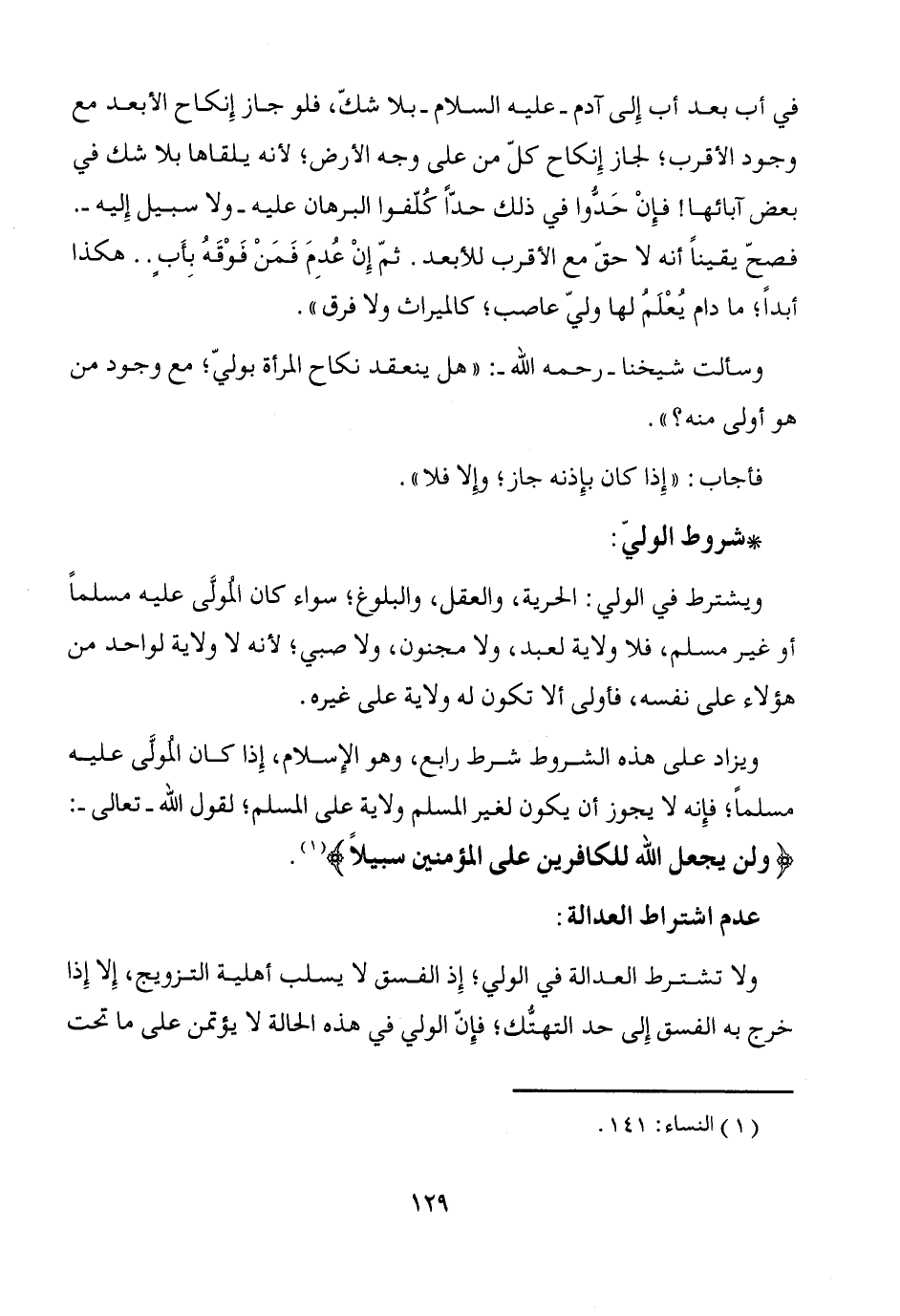 في أب بعد أب إِلى آدم -عليه السلام- بلا شكّ، فلو جاز إِنكاح الأبعد مع وجود الأقرب؛ لجاز إِنكاح كلّ من على وجه الأرض؛ لأنه يلقاها بلا شك في بعض آبائها! فإِنْ حَدُّوا في ذلك حدّاً كُلّفوا البرهان عليه -ولا سبيل إِليه-. فصحّ يقيناً أنه لا حقّ مع الأقرب للأبعد. ثمّ إِنْ عُدِمَ فَمَنْ فَوْقَهُ بِأَبٍ .. هكذا أبداً؛ ما دام يُعْلَمُ لها وليّ عاصب؛ كالميراث ولا فرق".