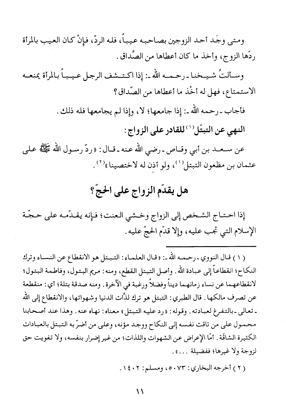 (¬1) قال النووي -رحمه الله-: "قال العلماء: التبتل هو الانقطاع عن النساء وترك النكاح؛ انقطاعاً إِلى عبادة الله. وأصل التبتل القطع، ومنه: مريم البتول، وفاطمة البتول؛ لانقطاعهما عن نساء زمانهما ديناً وفضلاً ورغبة في الآخرة. ومنه صدقة بتلة؛ أي: منقطعة عن تصرف مالكها. قال الطبري: التبتل هو ترك لذَّات الدنيا وشهواتها، والانقطاع إِلى الله -تعالى- بالتفرغ لعبادته. وقوله: "رد عليه التبتل" معناه: نهاه عنه. وهذا عند أصحابنا محمول على من تاقت نفسه إِلى النكاح ووجد مؤنه، وعلى من أضرّ به التبتل بالعبادات الكثيرة الشاقّة. أمّا الإِعراض عن الشهوات واللذات؛ من غير إِضرار بنفسه، ولا تفويت حق لزوجة ولا غيرها؛ ففضيلة ... ".