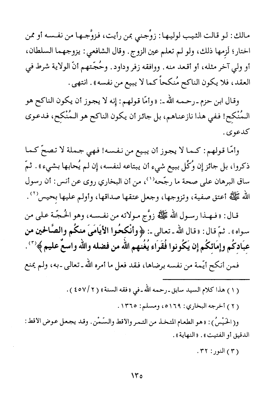 قال: "فهذا رسول الله - صَلَّى اللَّهُ عَلَيْهِ وَسَلَّمَ - زوَّج مولاته من نفسه، وهو الحُجّة على من سواه". ثمّ قال: "قال الله -تعالى-: {وأنْكحُوا الأيَامَىَ منكم والصَّالحين من