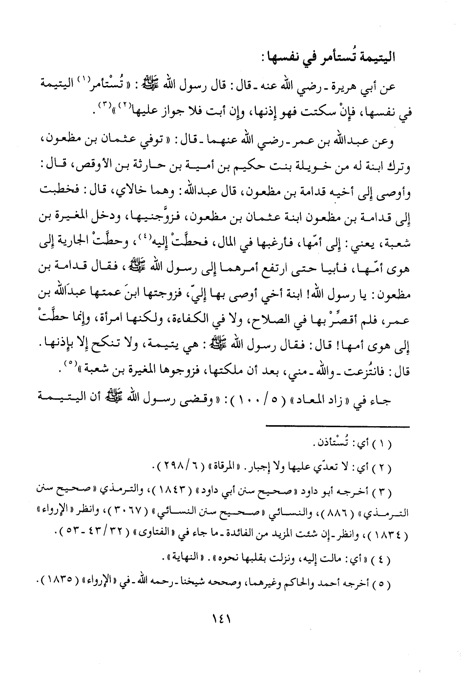عن أبي هريرة -رضي الله عنه- قال: قال رسول الله - صَلَّى اللَّهُ عَلَيْهِ وَسَلَّمَ -: "تُسْتأمر (¬1) اليتيمة في نفسها، فإِنْ سكتت فهو إِذنها، وإن أبت فلا جواز عليها (¬2) " (¬3).