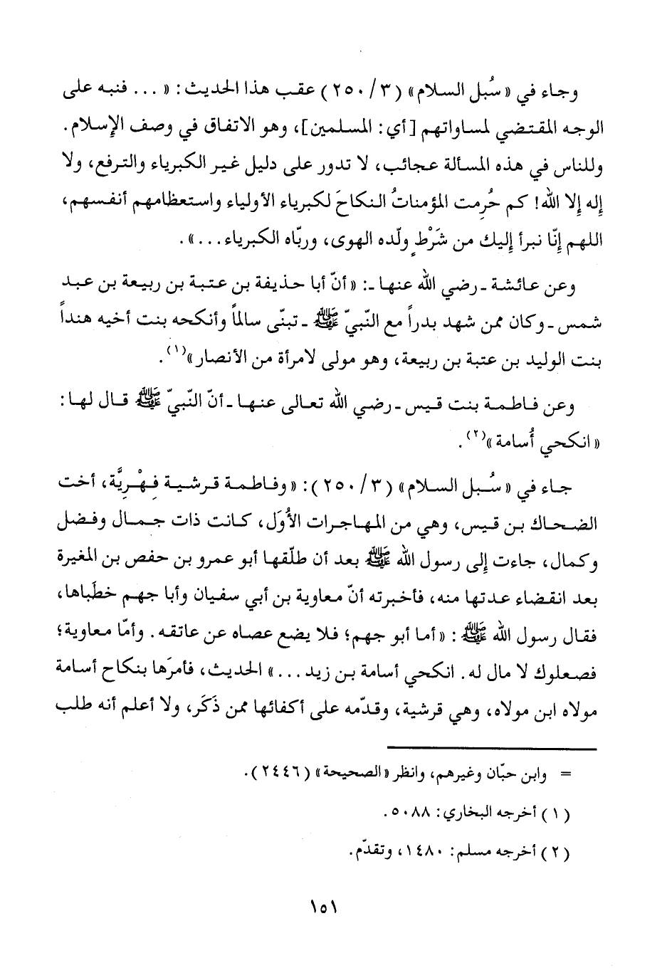 وعن فاطمة بنت قيس -رضي الله تعالى عنها- أنّ النّبيّ - صَلَّى اللَّهُ عَلَيْهِ وَسَلَّمَ - قال لها: "انكحي أُسامة" (¬2).