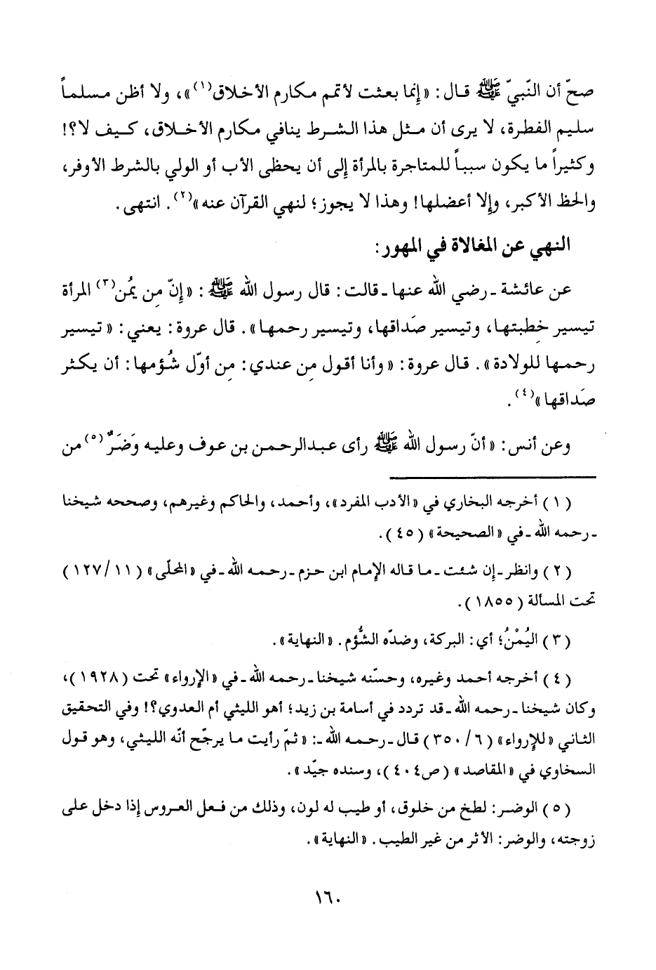 صحّ أن النبيّ - صَلَّى اللَّهُ عَلَيْهِ وَسَلَّمَ - قال: "إِنما بعثتُ لأتمم مكارم الأخلاق (¬1) "، ولا أظن مسلماً سليم الفطرة، لا يرى أن مثل هذا الشرط ينافي مكارم الأخلاق، كيف لا؟! وكثيراً ما يكون سبباً للمتاجرة بالمرأة إِلى أن يحظى الأب أو الولي بالشرط الأوفر، والحظ الأكبر، وإلا أعضلها! وهذا لا يجوز؛ لنهي القرآن عنه" (¬2). انتهى.