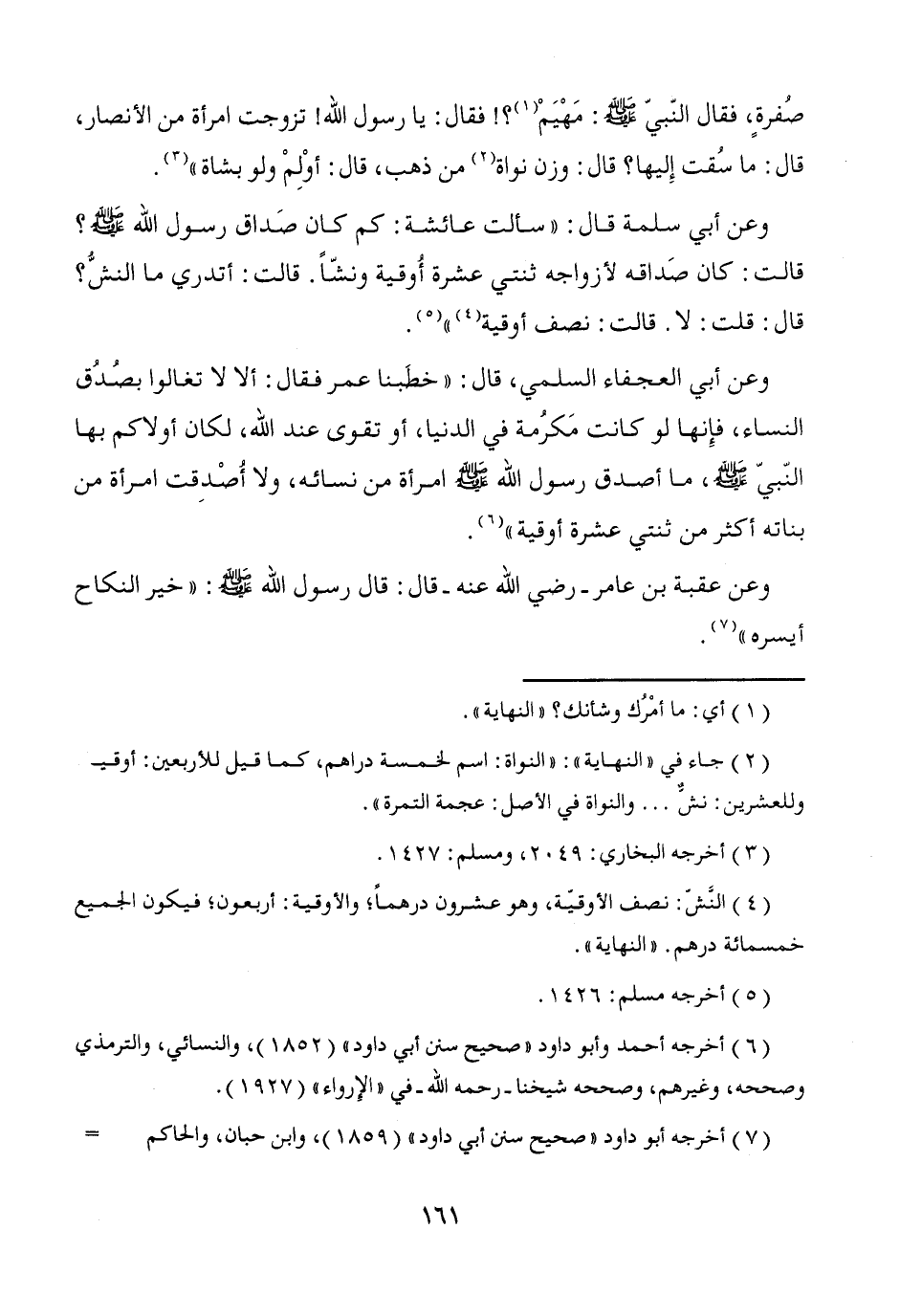 وعن أبي سلمة قال: "سألت عائشة: كم كان صَداق رسول الله - صَلَّى اللَّهُ عَلَيْهِ وَسَلَّمَ -؟ قالت: كان صَداقه لأزواجه ثنتي عشرة أُوقية ونشّاً. قالت: أتدري ما النشُّ؟ قال: قلت: لا. قالت: نصف أوقية (¬4) " (¬5).