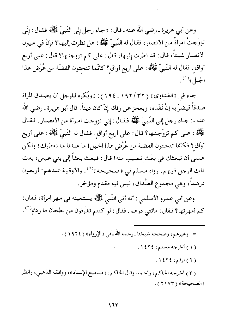 جاء في "الفتاوى" (32/ 192 - 194): "ويُكره للرجل أن يصدق المرأة صدقاً فيضرّ به إِنْ نَقَده، ويعجز عن وفائه إِنْ كان ديناً. قال أبو هريرة -رضي الله عنه-: جاء رجل إِلى النّبيّ - صَلَّى اللَّهُ عَلَيْهِ وَسَلَّمَ - فقال: إِني تزوجت امرأة من الأنصار. فقال - صَلَّى اللَّهُ عَلَيْهِ وَسَلَّمَ -: على كم تزوّجتها؟ قال: على أربع أواقٍ. فقال له النّبيّ - صَلَّى اللَّهُ عَلَيْهِ وَسَلَّمَ -: على أربع أوَاقٍ؟ فكأنما تنحتون الفضة من عُرْض هذا الجبل! ما عندنا ما نعطيك؛ ولكن عسى أن نبعثك في بعْث تصيب منه! قال: فبعث بعثاً إِلى بني عبس، بعث ذلك الرجل فيهم. رواه مسلم في "صحيحه" (¬2). والأوقية عندهم: أربعون درهماً، وهي مجموع الصَّداق، ليس فيه مقدم ومؤخر.