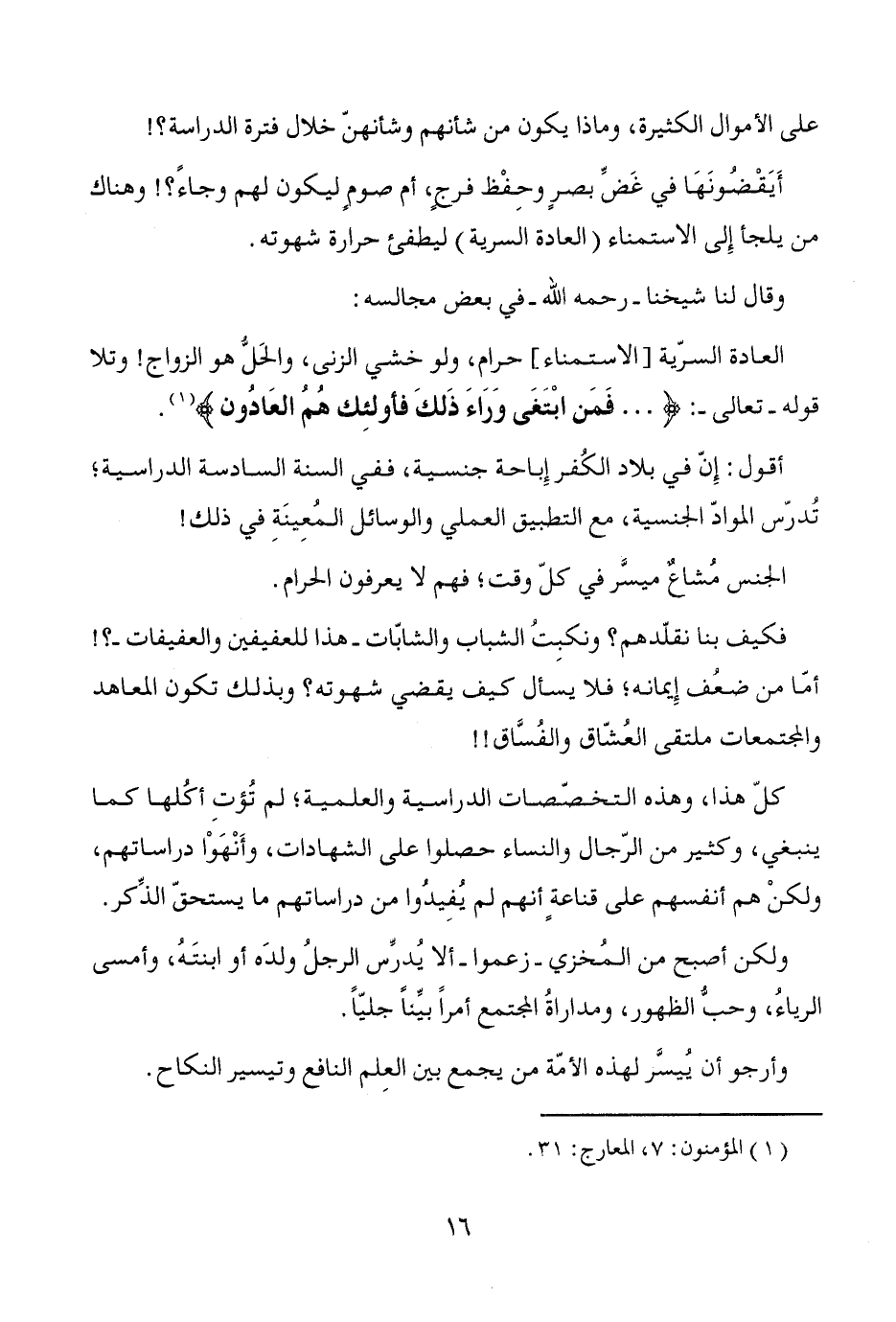 على الأموال الكثيرة، وماذا يكون من شأنهم وشأنهنّ خلال فترة الدراسة؟! أَيَقْضُونَهَا في غَضِّ بصرٍ وحِفْظ فرجٍ، أم صومٍ ليكون لهم وجاءً؟! وهناك من يلجأ إِلى الاستمناء (العادة السرية) ليطفئ حرارة شهوته.