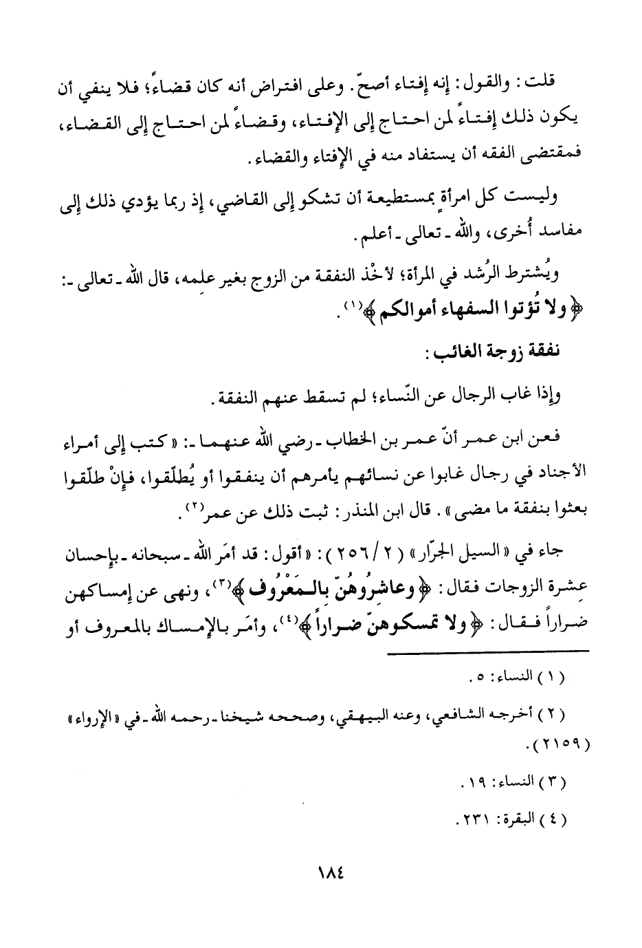 جاء قي "السيل الجرّار" (2/ 256): "أقول: قد أمَر الله -سبحانه- بإِحسان عِشرة - صَلَّى اللَّهُ عَلَيْهِ وَسَلَّمَ - زوجات فقال: {وعاشِرُوهُنّ بِالمَعْرُوف} (¬3)، ونهى عن إِمساكهن ضراراً فقال: {ولا تمسكوهنّ ضراراً} (¬4)، وأمَر بالإِمساك بالمعروف أو