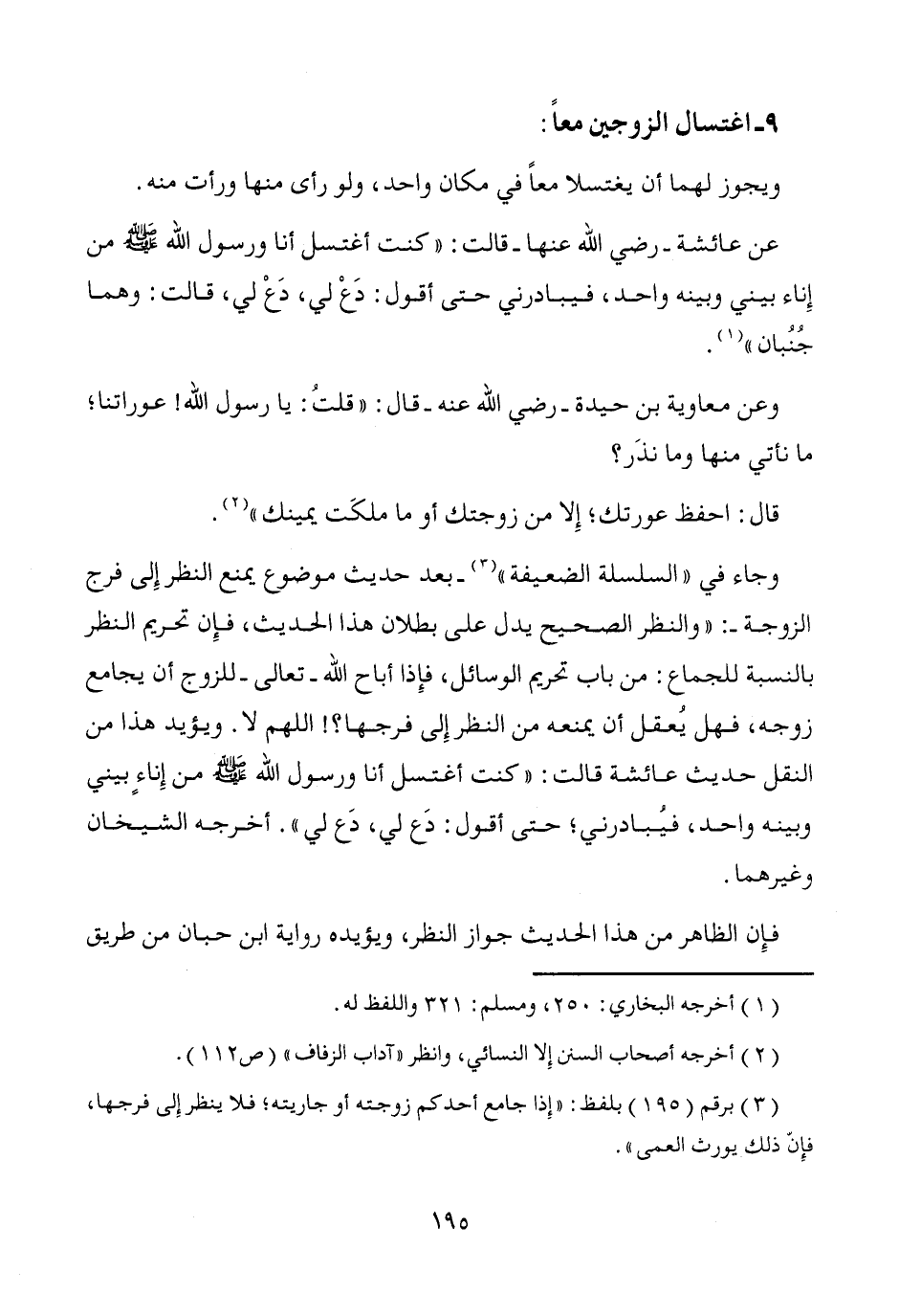وجاء في "السلسلة الضعيفة" (¬3) -بعد حديث موضوع يمنع النظر إِلى فرج الزوجة-: "والنظر الصحيح يدل على بطلان هذا الحديث، فإِن تحريم النظر بالنسبة للجماع: من باب تحريم الوسائل، فإِذا أباح الله -تعالى- للزوج أن يجامع زوجه، فهل يُعقل أن يمنعه من النظر إِلى فرجها؟! اللهم لا. ويؤيد هذا من النقل حديث عائشة قالت: "كنت أغتسل أنا ورسول الله - صَلَّى اللَّهُ عَلَيْهِ وَسَلَّمَ - من إِناءٍ بيني وبينه واحد، فيُبادرني؛ حتى أقول: دَع لي، دَع لي". أخرجه الشيخان وغيرهما.