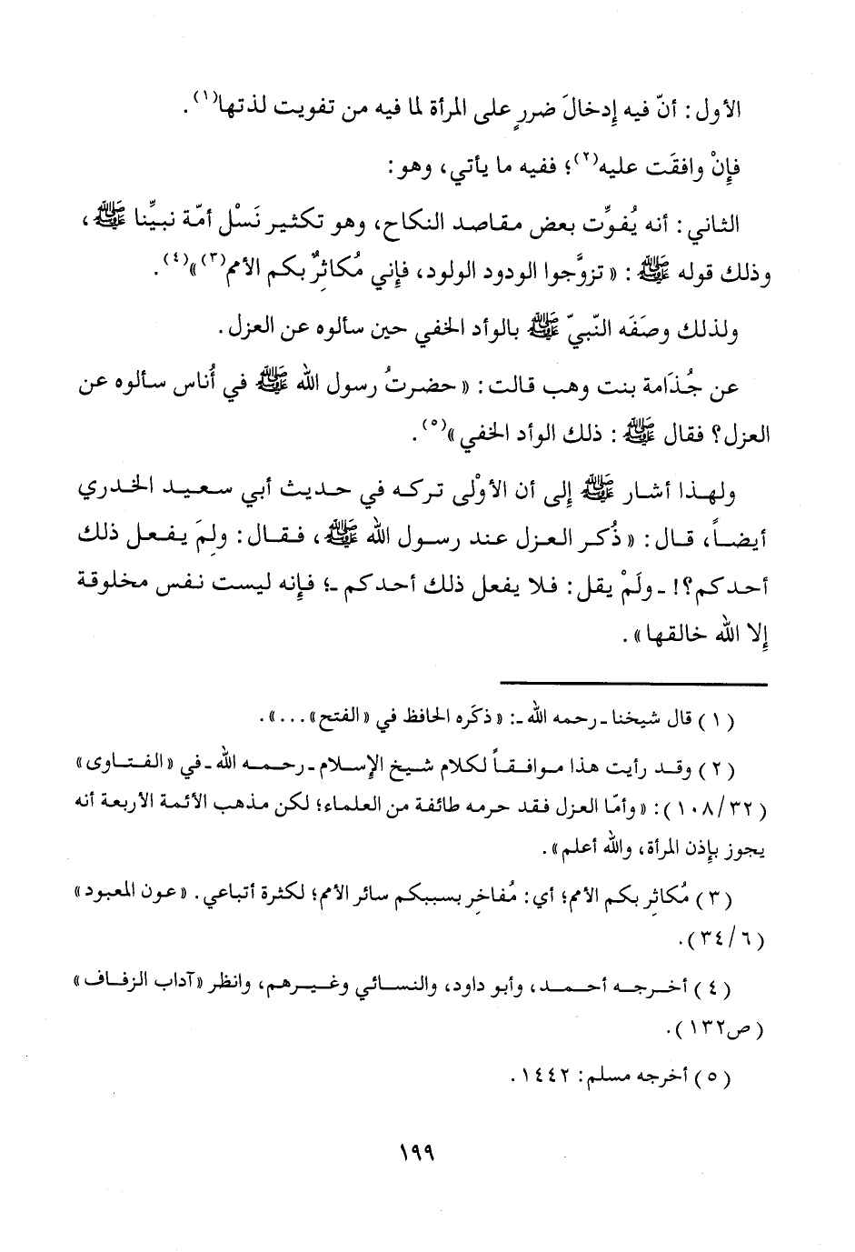 (¬2) وقد رأيت هذا موافقاً لكلام شيخ الإِسلام -رحمه الله- في "الفتاوى" (32/ 108): "وأمّا العزل فقد حرمه طائفة من العلماء؛ لكن مذهب الأئمة الأربعة أنه يجوز بإِذن المرأة، والله أعلم".