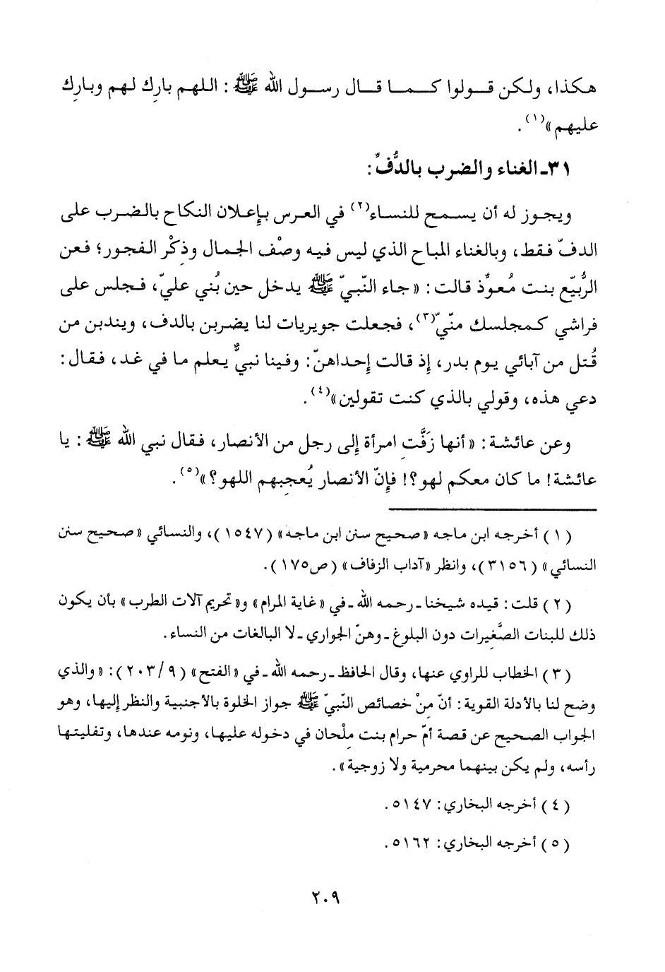(¬2) قلت: قيده شيخنا -رحمه الله- في "غاية المرام" و"تحريم آلات الطرب" بأن يكون ذلك للبنات الصَّغِيرات دون البلوغ -وهن الجواري- لا البالغات من النساء.